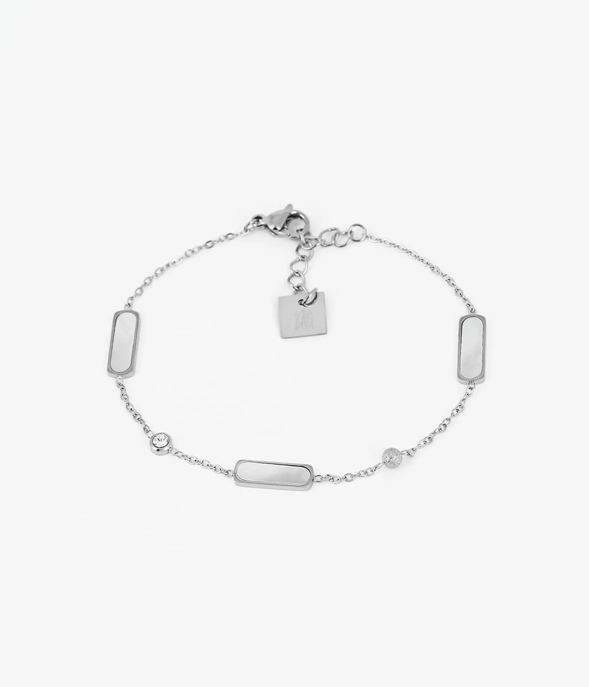 Ce bracelet en acier uni ou doré à l’or fin, dépeint un subtil mélange de zirconiums et de nacre blanche.