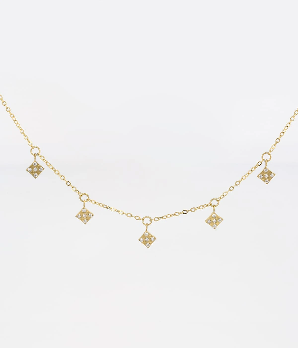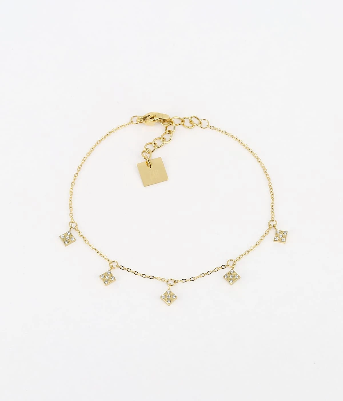 Des pampilles pavées de zirconiums brillants sont attachées sur ce bracelet chaînette en acier doré à l’or fin.