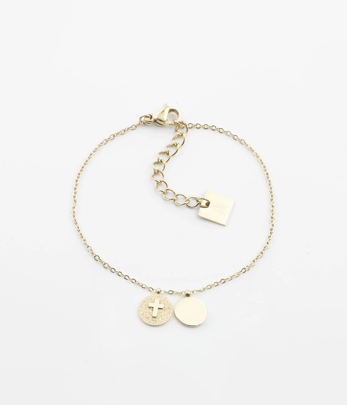 Bracelet chaînette en acier doré à l’or fin sur lequel deux petites médailles sont attachées.