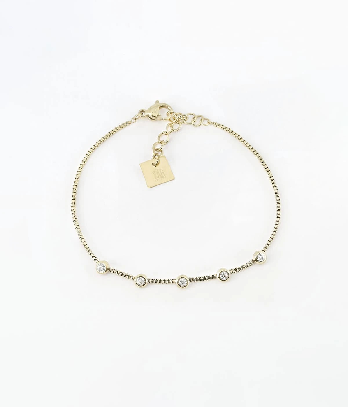 Bracelet chaîne en acier doré à l’or fin parsemé de zirconiums brillants en serti clos.
