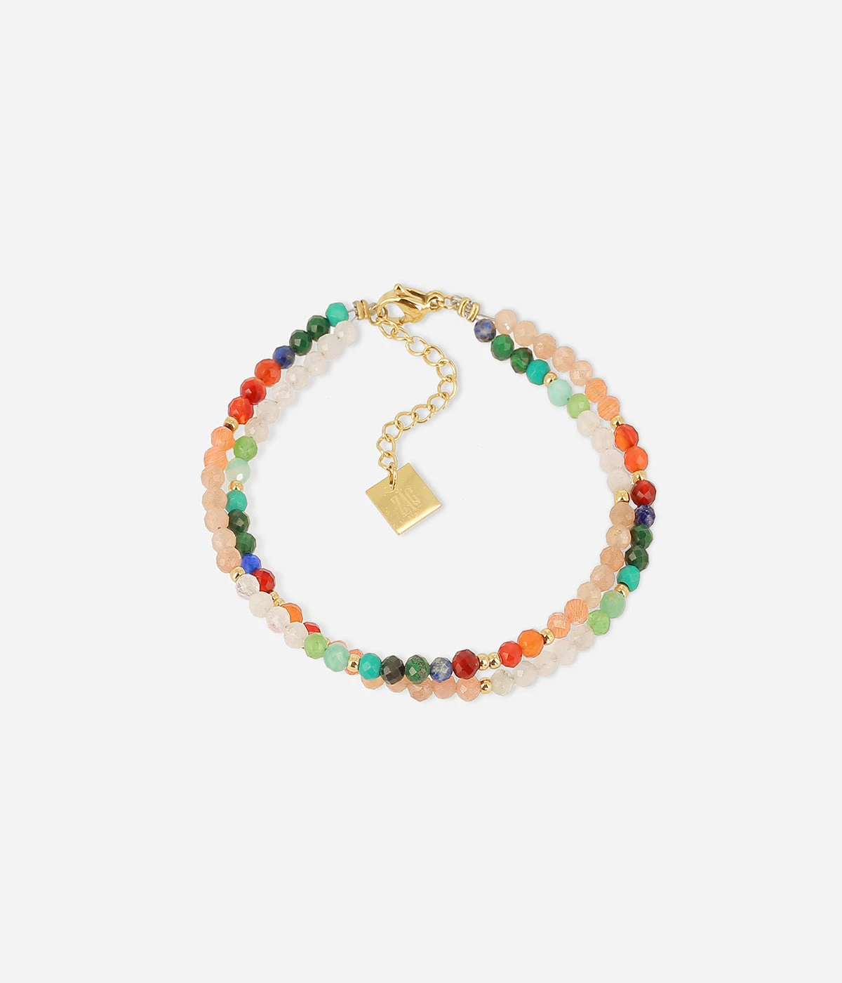 Bracelet à double rang en acier doré sur lequel des pierres colorées sont enfilées.