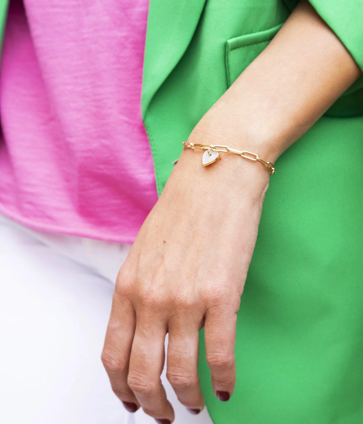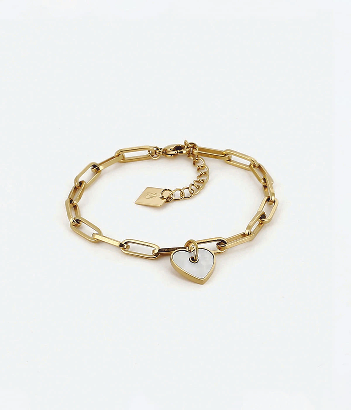 Bracelet chaînette sur lequel est attaché un petit cœur en nacre.
