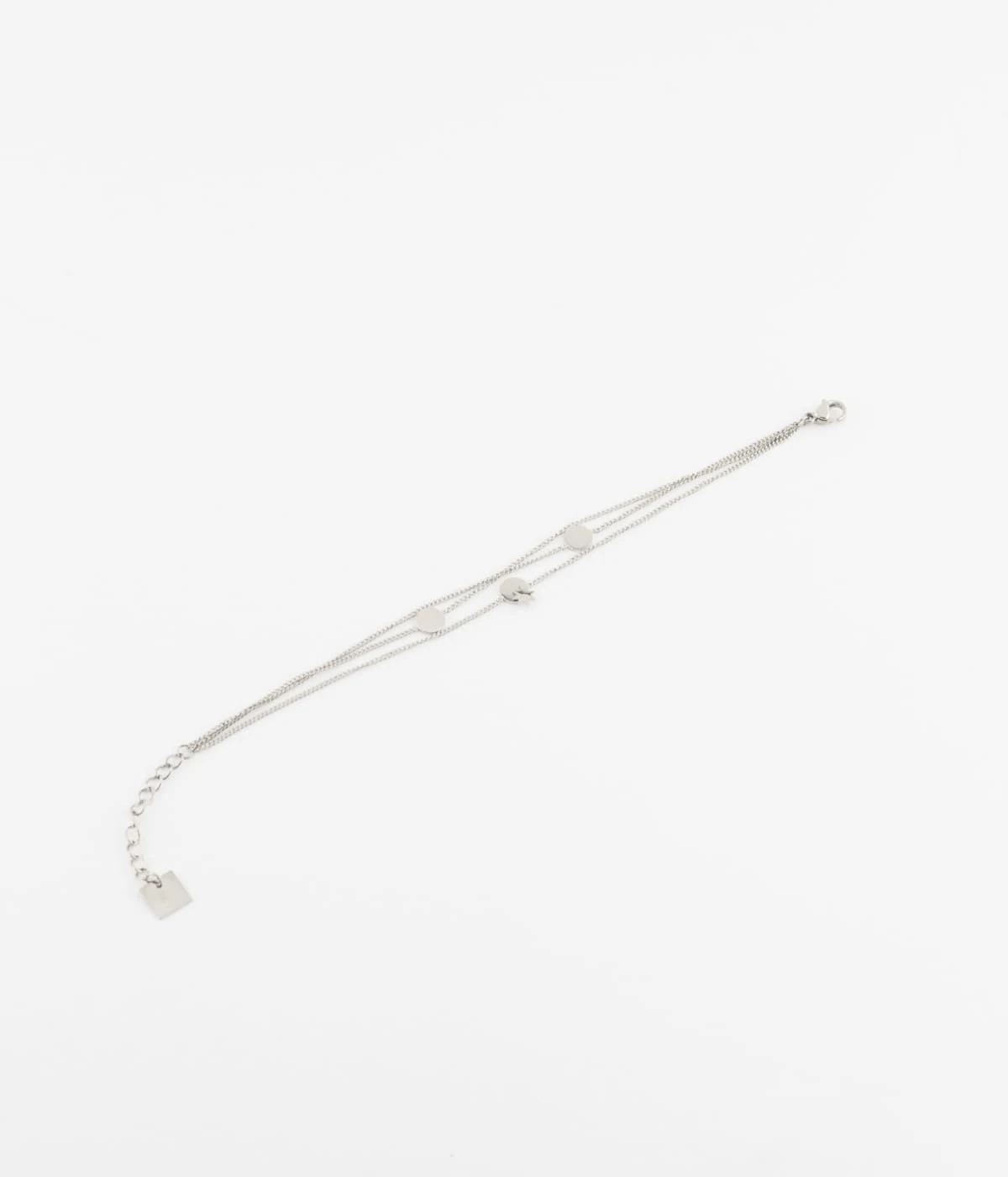 Bracelet double chaîne en acier uni ou doré à l’or fin parsemé de trois petites médailles en métal dont celle du centre est décorée d’un motif d’étoile.