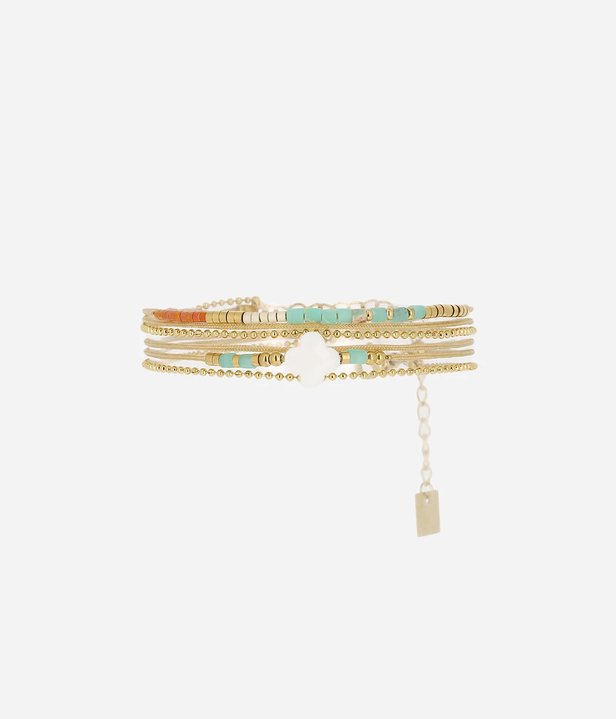 Ce bijou composé de petites rondelles de pierres et d’acier doré à l’or fin, accompagné du trèfle emblématique est parfait pour être porté en accumulation sur votre poignet.