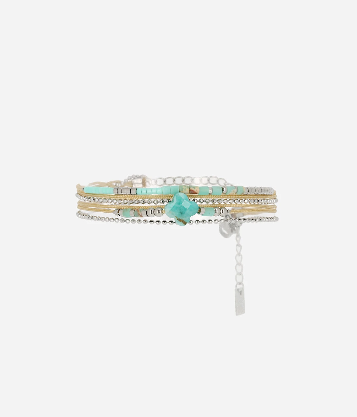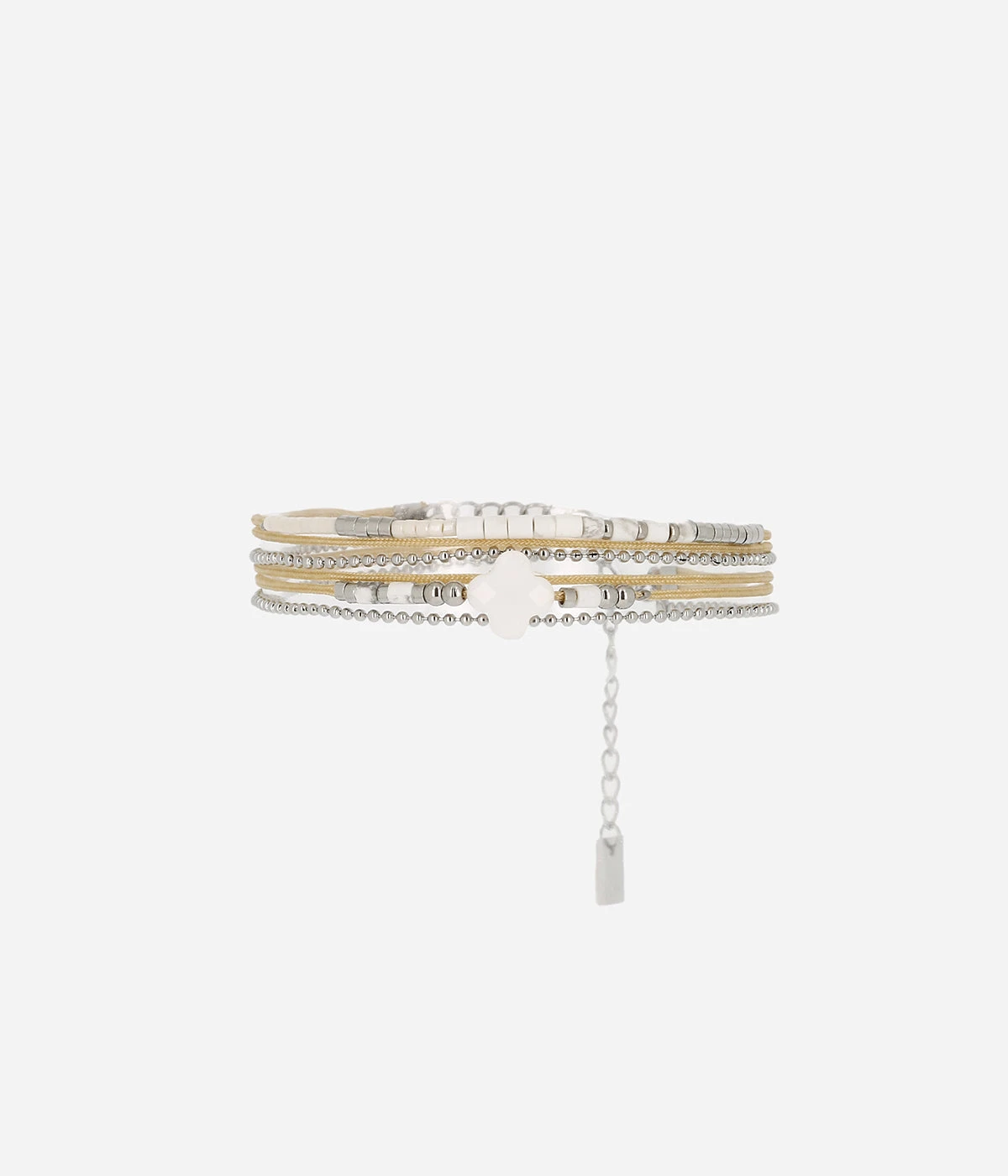 Ce bijou composé de petites rondelles de pierres et d’acier, accompagné du trèfle emblématique est parfait pour être porté en accumulation sur votre poignet.