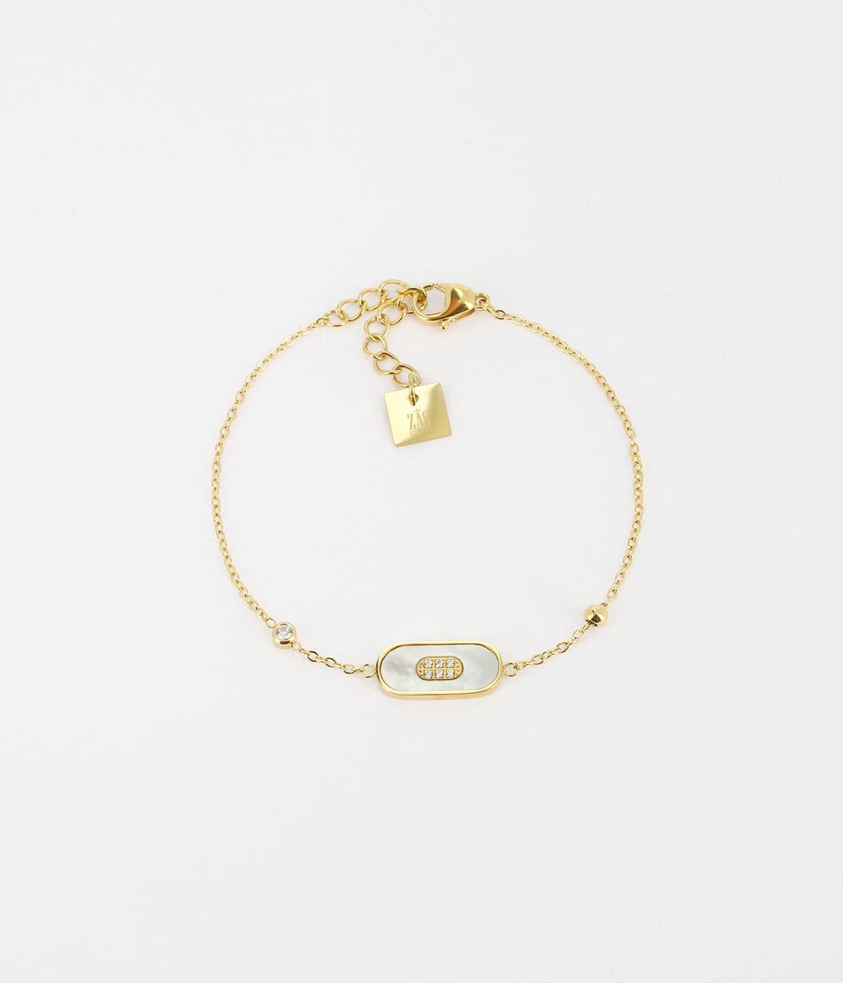 Bracelet en acier doré à l’or fin sur lequel est attaché un médaillon coloré serti de zirconiums en son centre.
