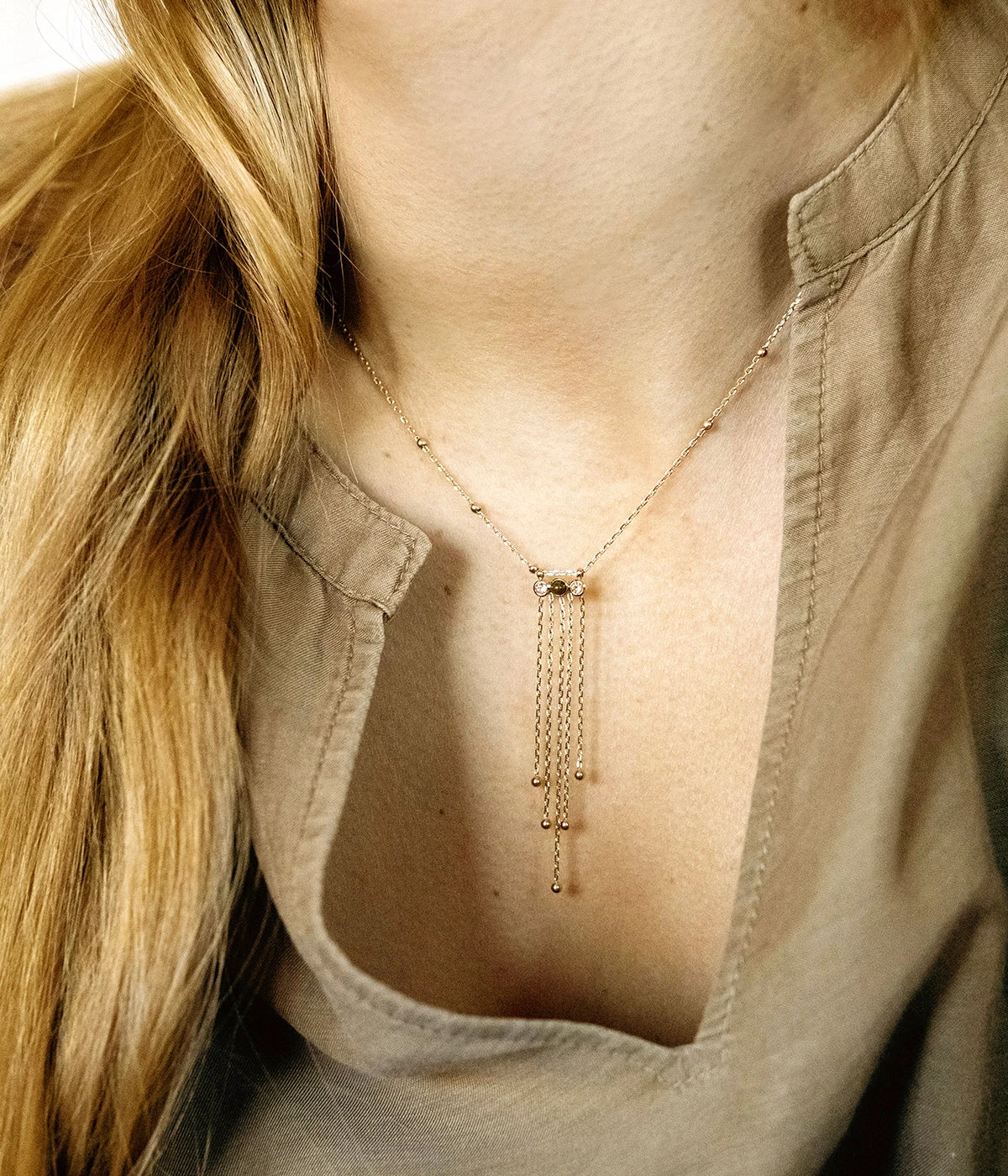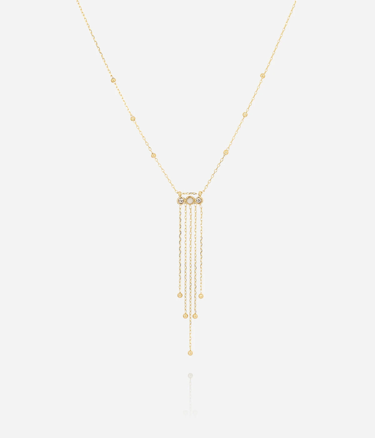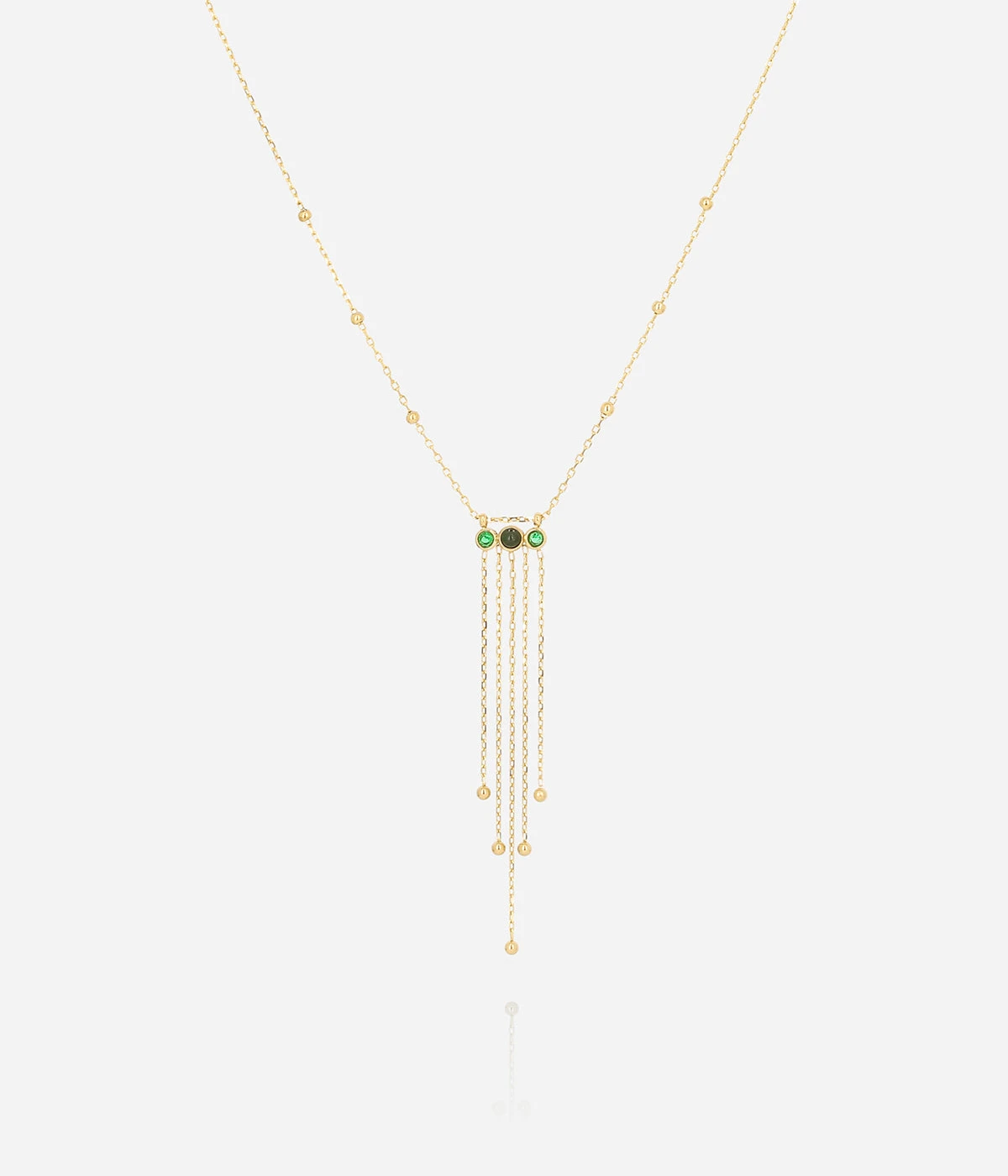 Collier en acier doré à l’or fin sur lequel se trouvent deux zirconiums colorés et une petite pierre naturelle au centre.
