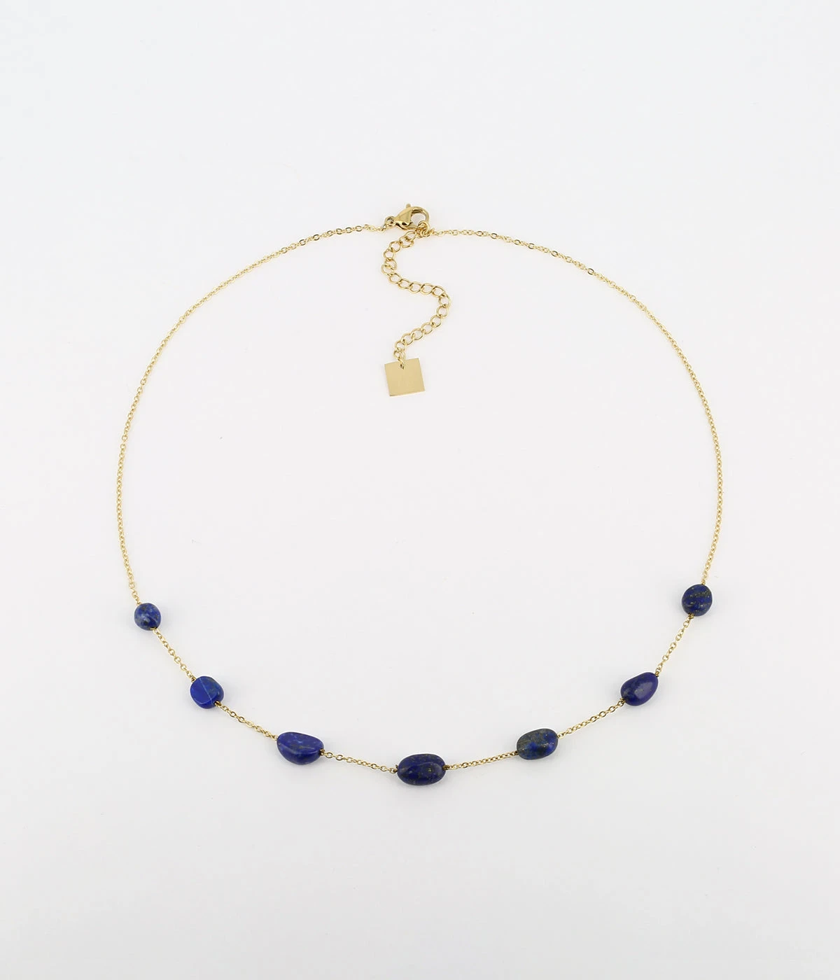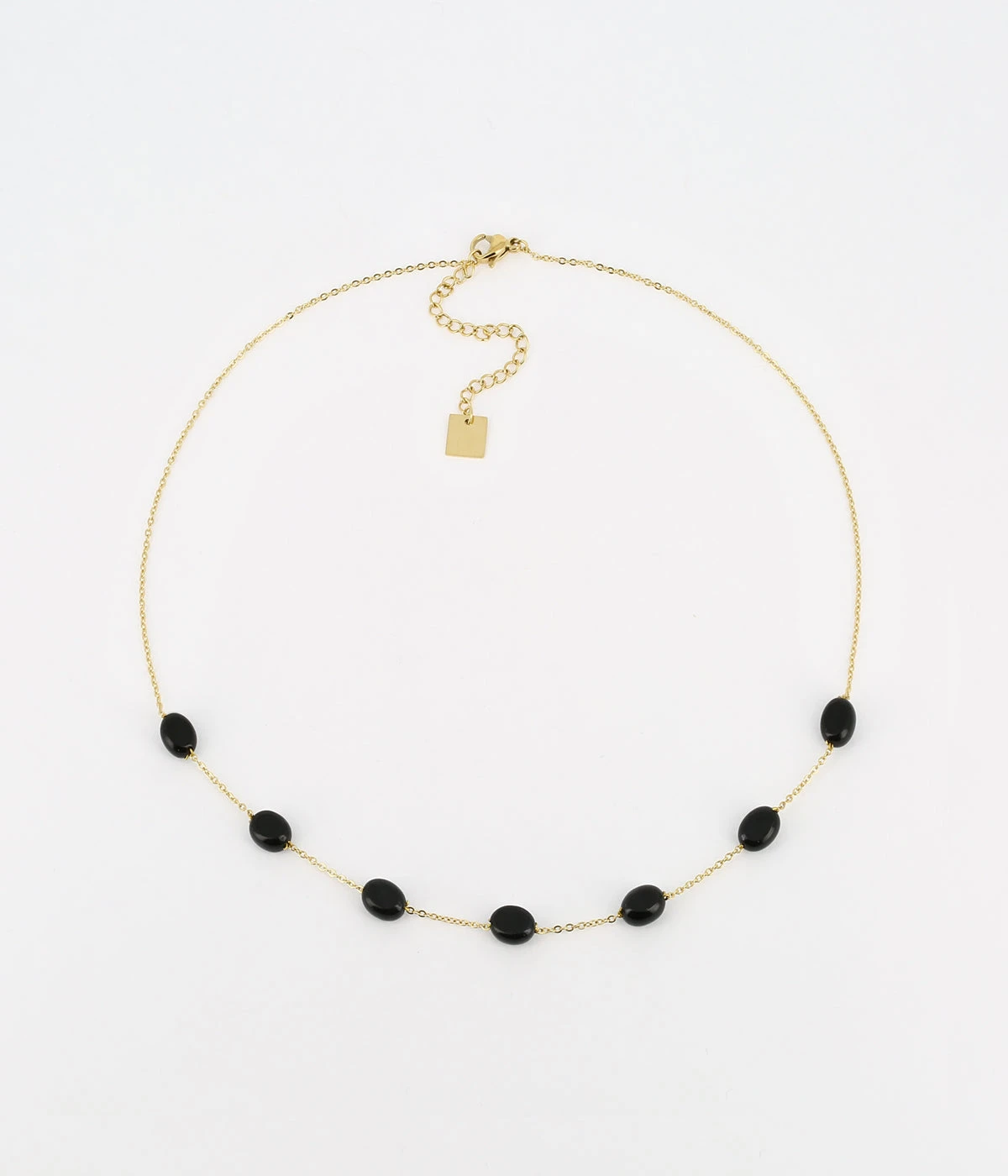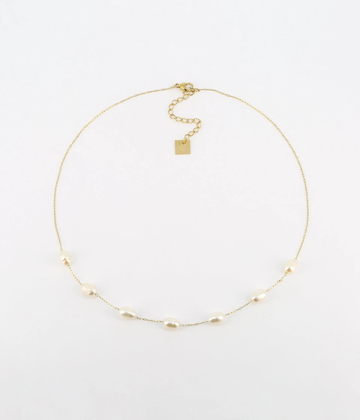 Collier en acier doré à l’or fin parsemé de sept perles blanches d’eau douce ou de pierres naturelles. Ce collier très délicat se porte avec d’autres colliers de nos collections.