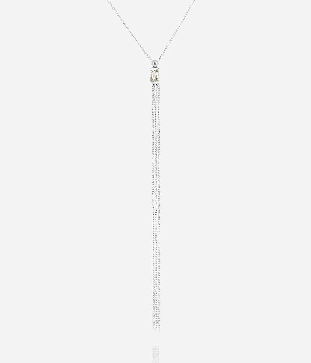 Collier en acier uni sur lequel deux zirconiums sont attachés. Trois chaînettes y sont suspendues.