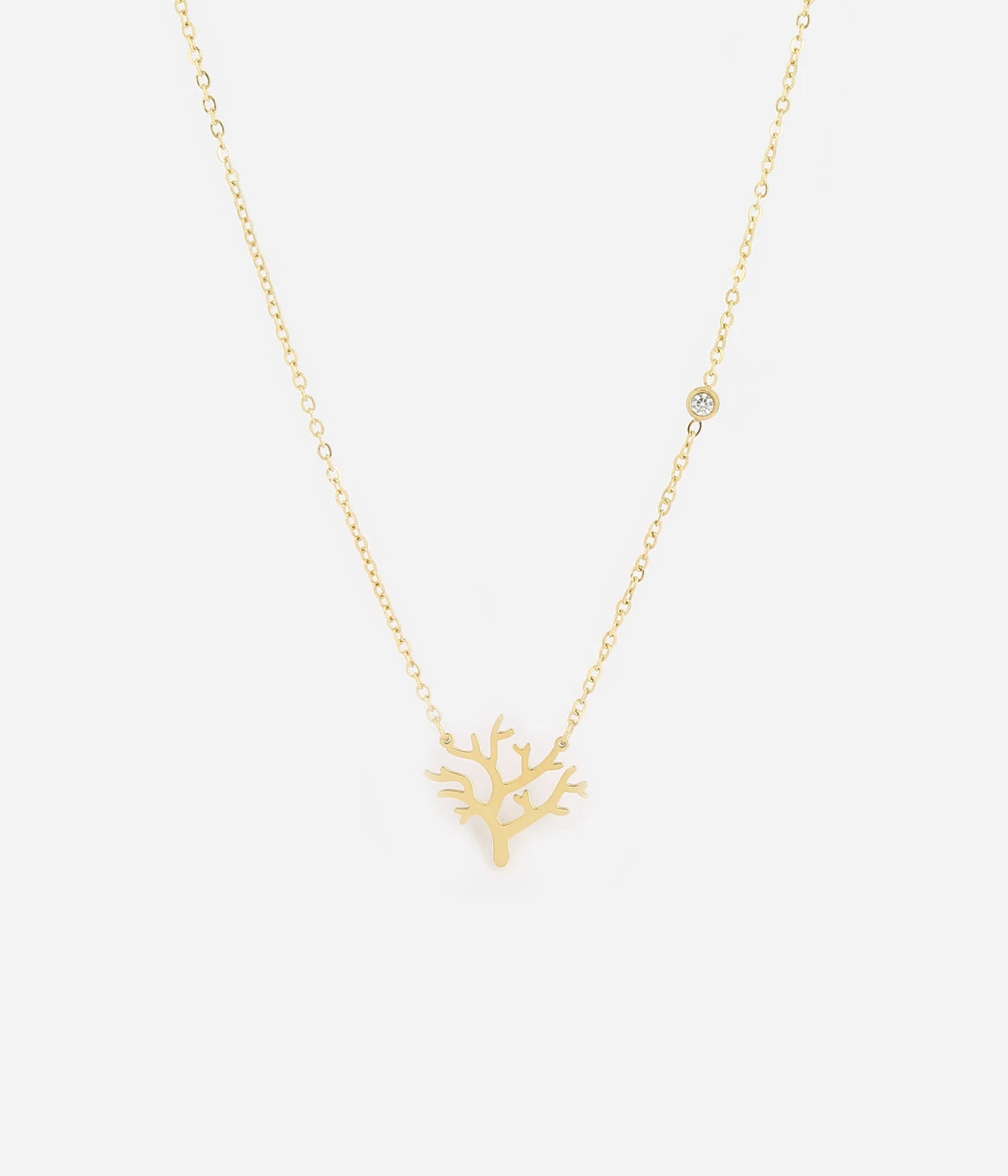 Collier en acier doré à l’or fin sur lequel est attaché un motif représentant l’arbre de vie.