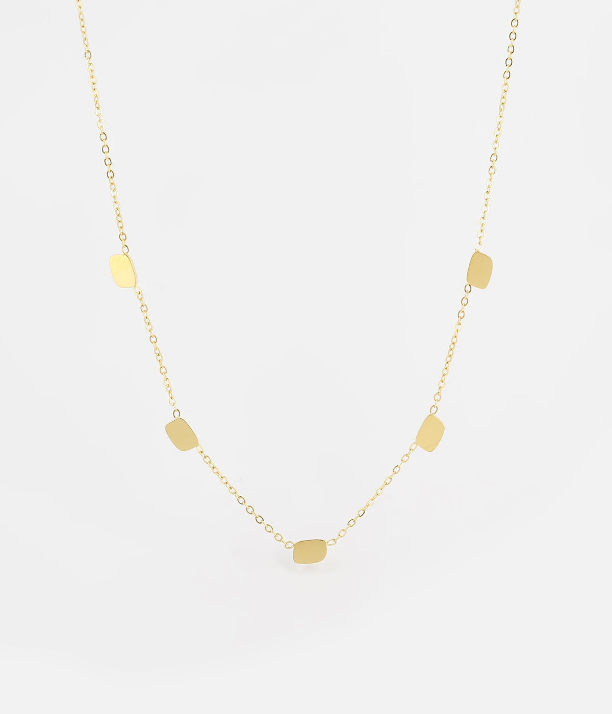Collier en acier uni ou doré à l’or fin sur lequel sont attachées des petites pastilles de forme rectangle arrondie.