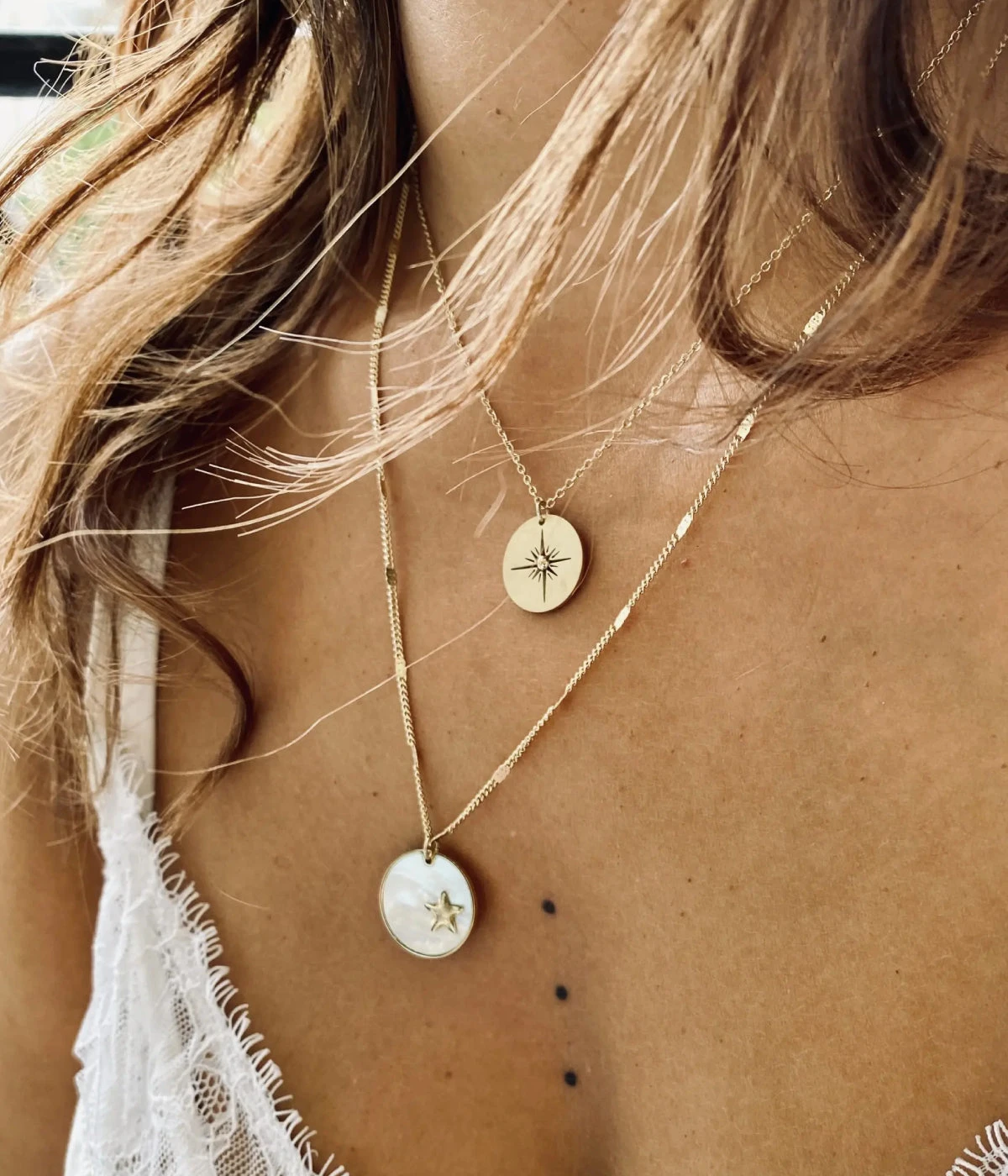 Collier en acier uni ou doré à l’or fin décoré d’une médaille finement gravée d’un motif d’Étoile du Nord.