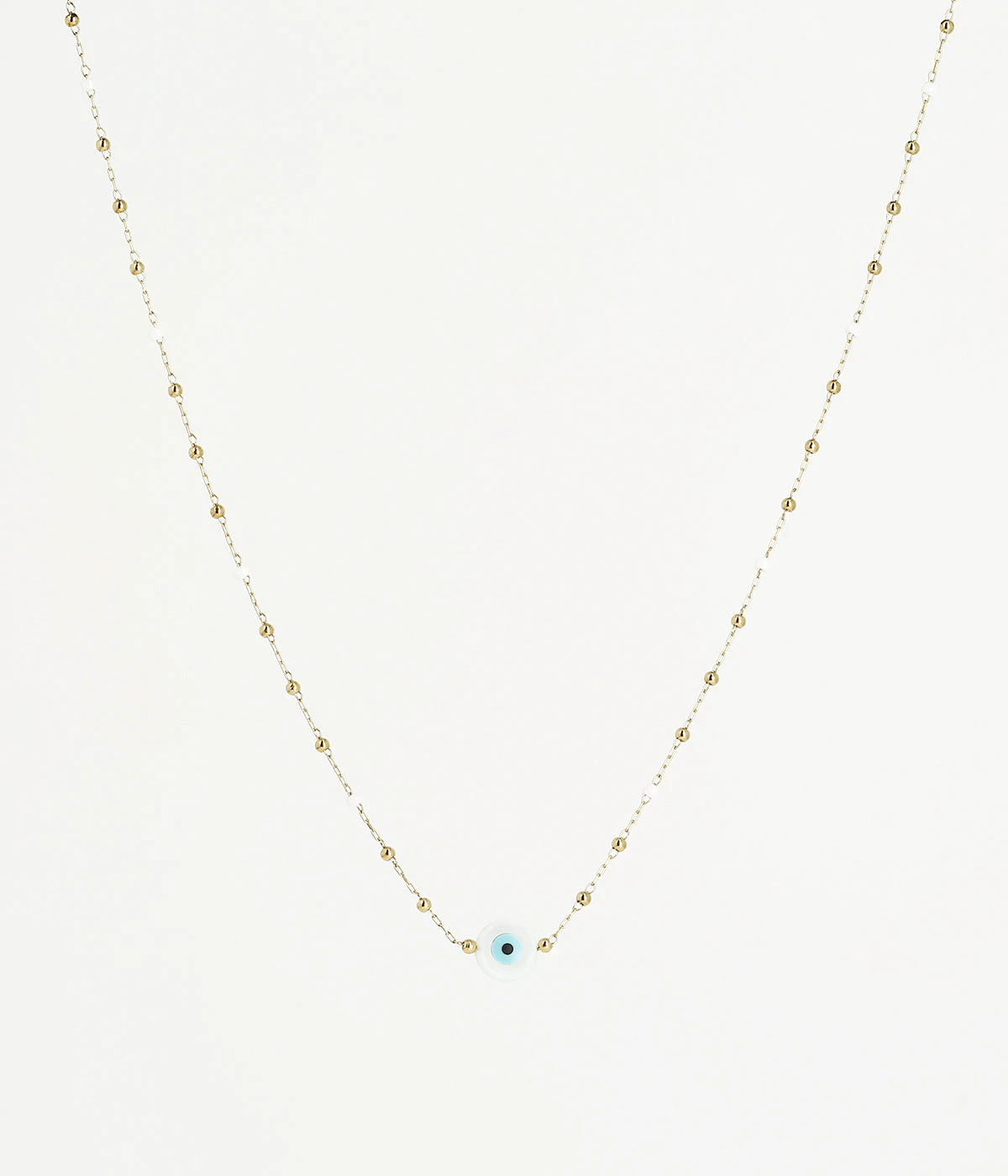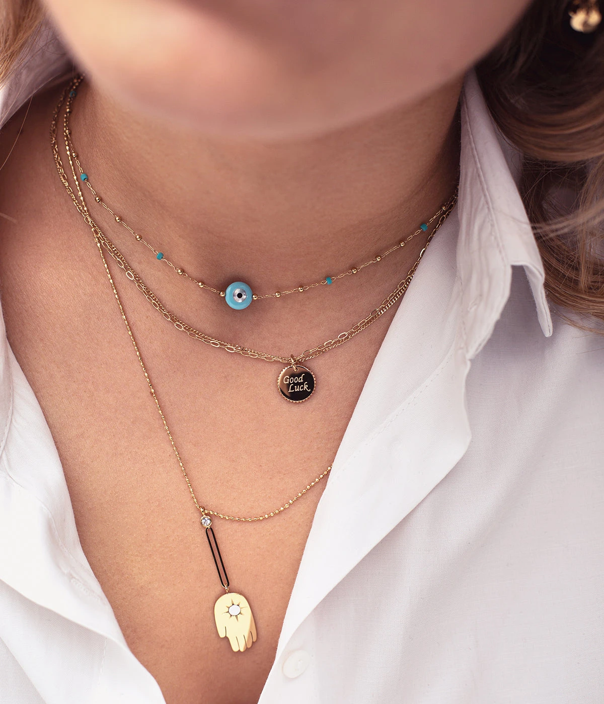 Collier chaîne “chapelet” en acier uni et doré à l’or fin sur lequel est attaché un motif de résine coloré représentant un petit œil protecteur.
