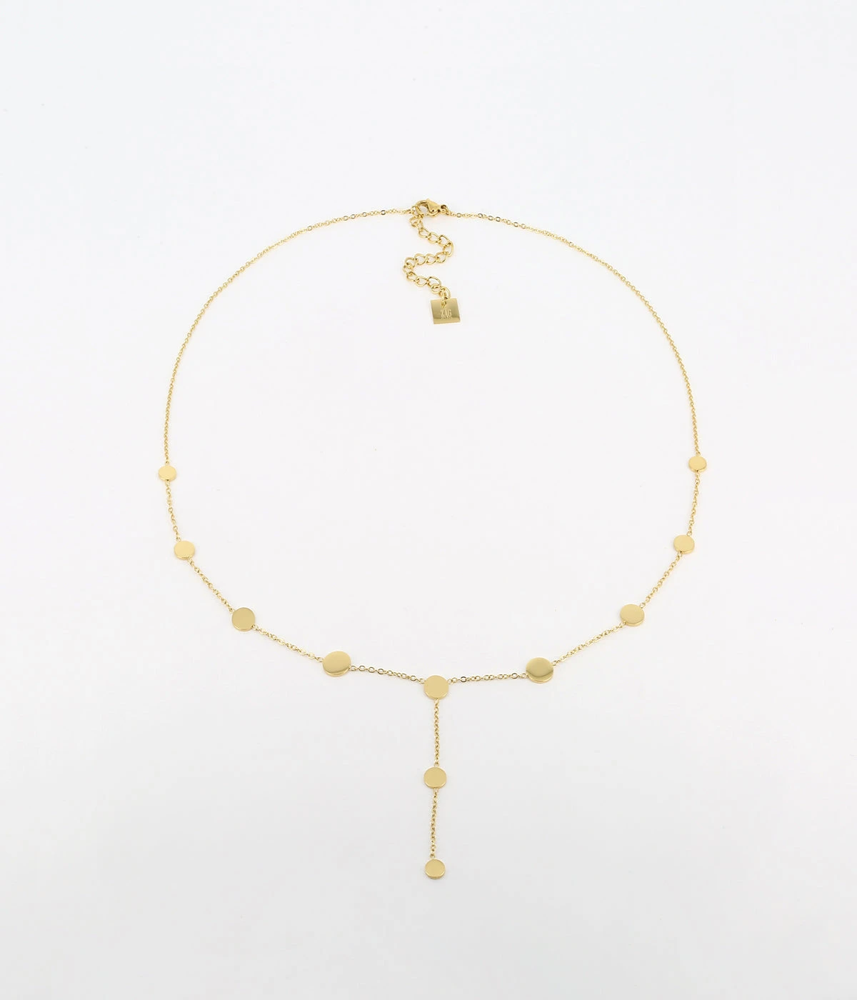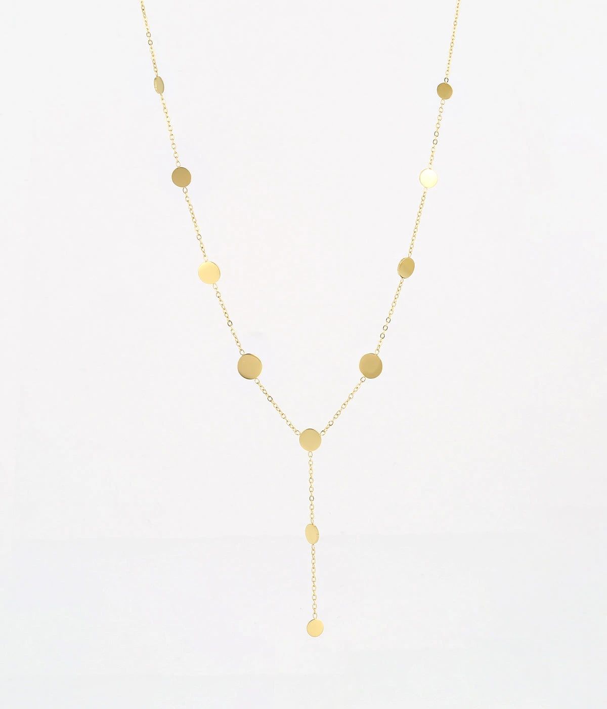 Collier chaînette en acier uni ou doré à l’or fin parsemé de petites plaques rondes brillantes de différentes tailles.