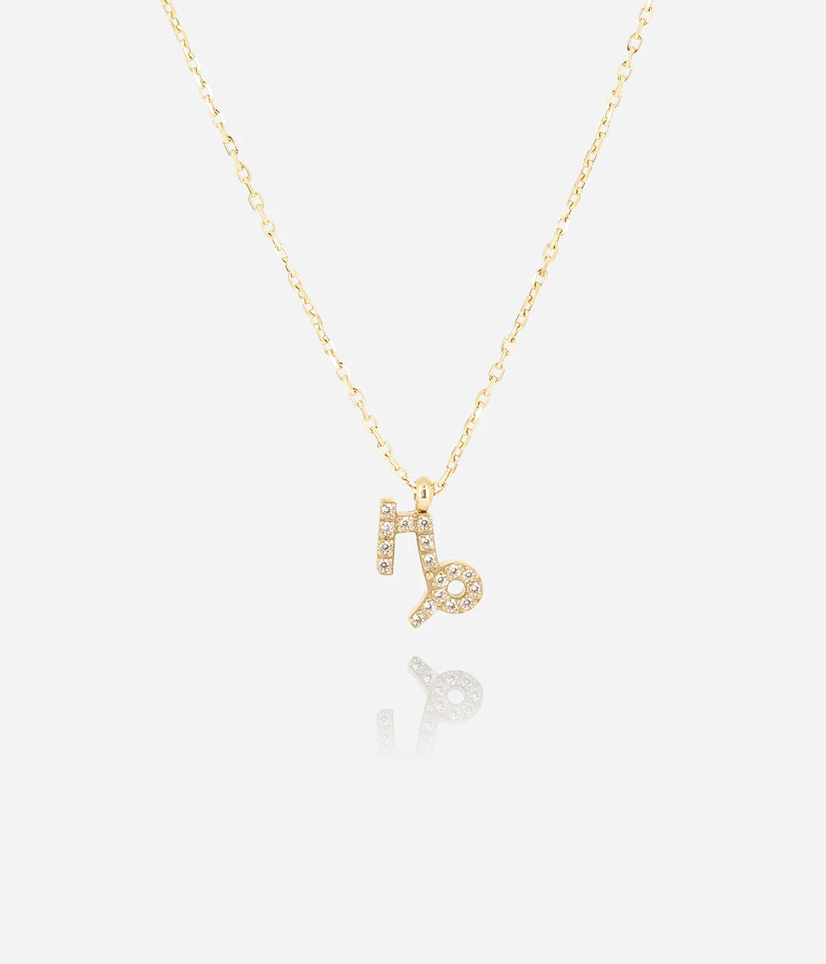 Collier en acier doré à l’or fin sur lequel se trouve un pendentif représentant le signe du zodiaque Capricorne, serti de zirconiums.