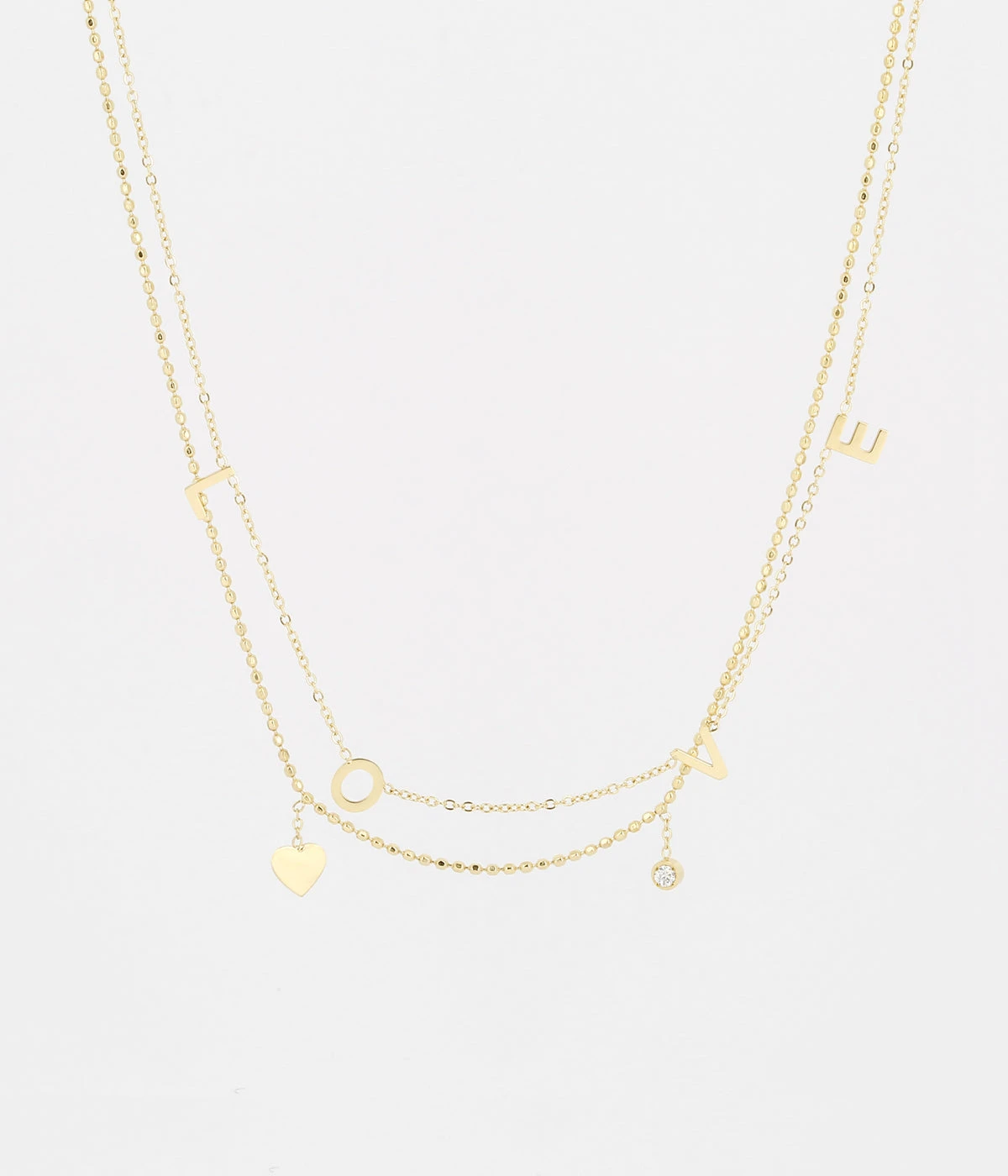 L’une des chaînes est composée du mot LOVE et sur l’autre chaîne sont suspendus un zirconium et une pampille en forme de cœur.