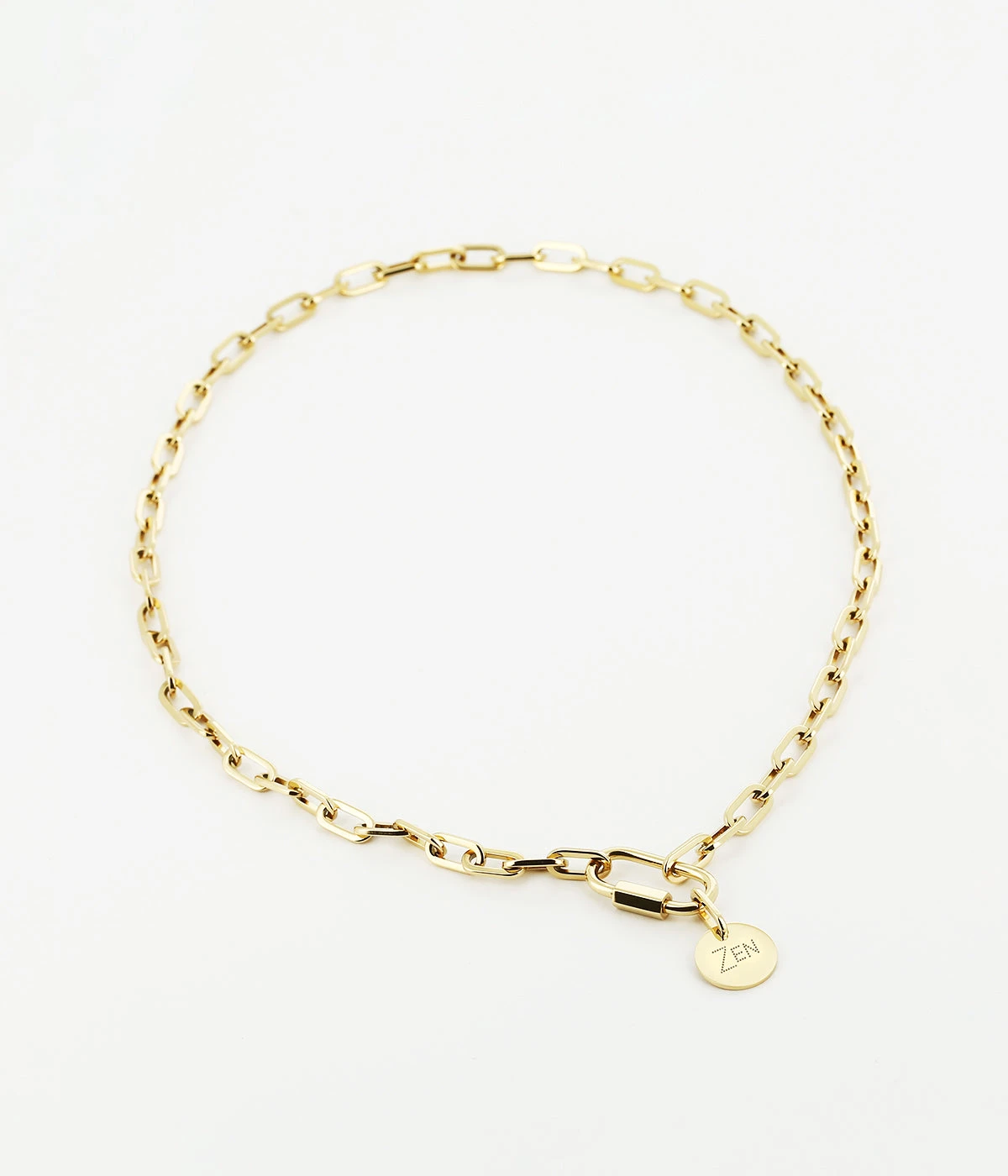 Collier chaîne à gros maillons en acier uni ou doré à l’or fin sur lequel est attachée une médaille gravée du mot « Zen ».