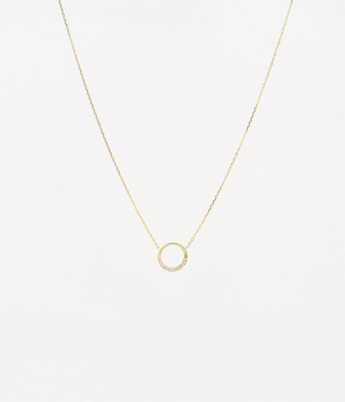 Collier en acier doré à l’or fin sur lequel est attaché un pendentif rond orné de zirconiums.