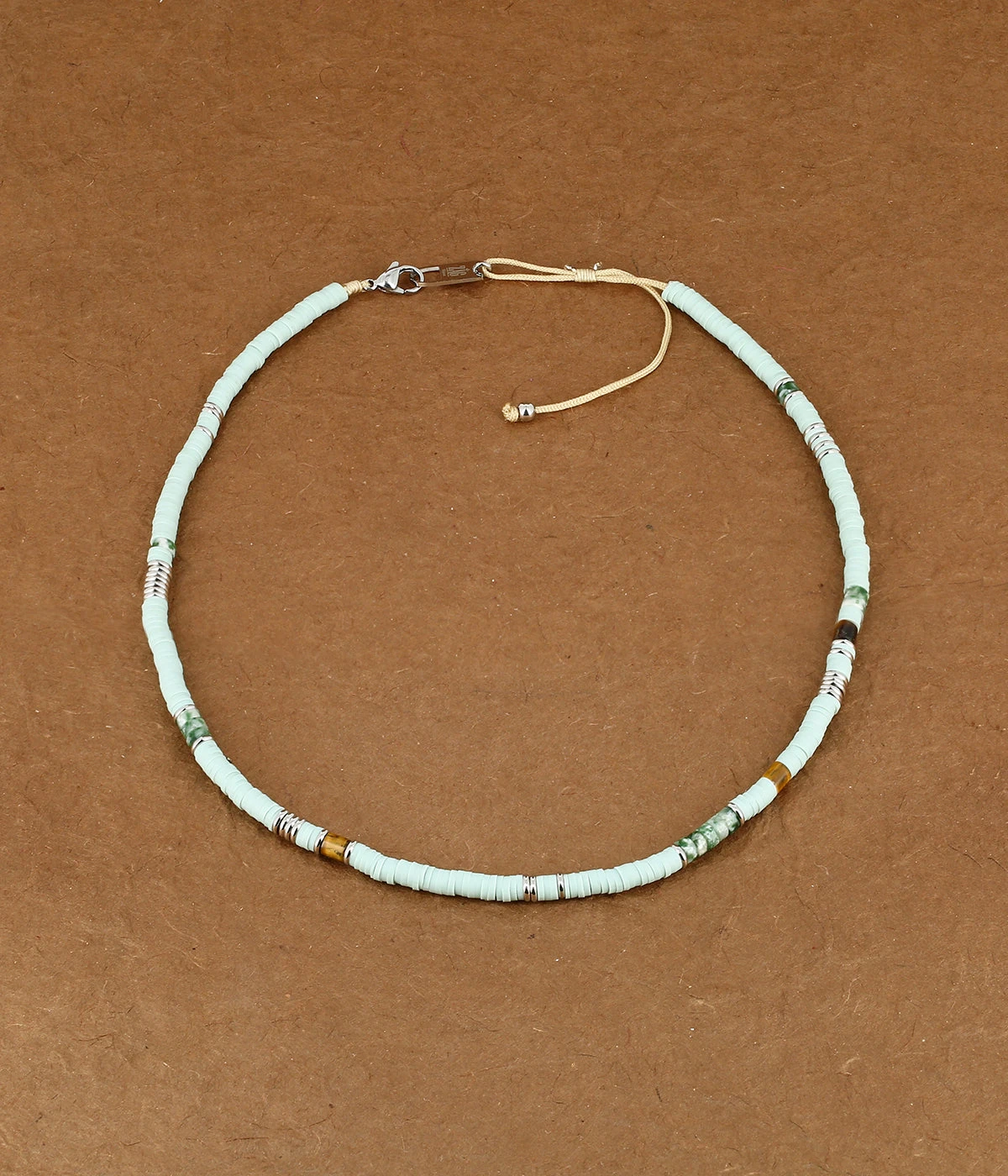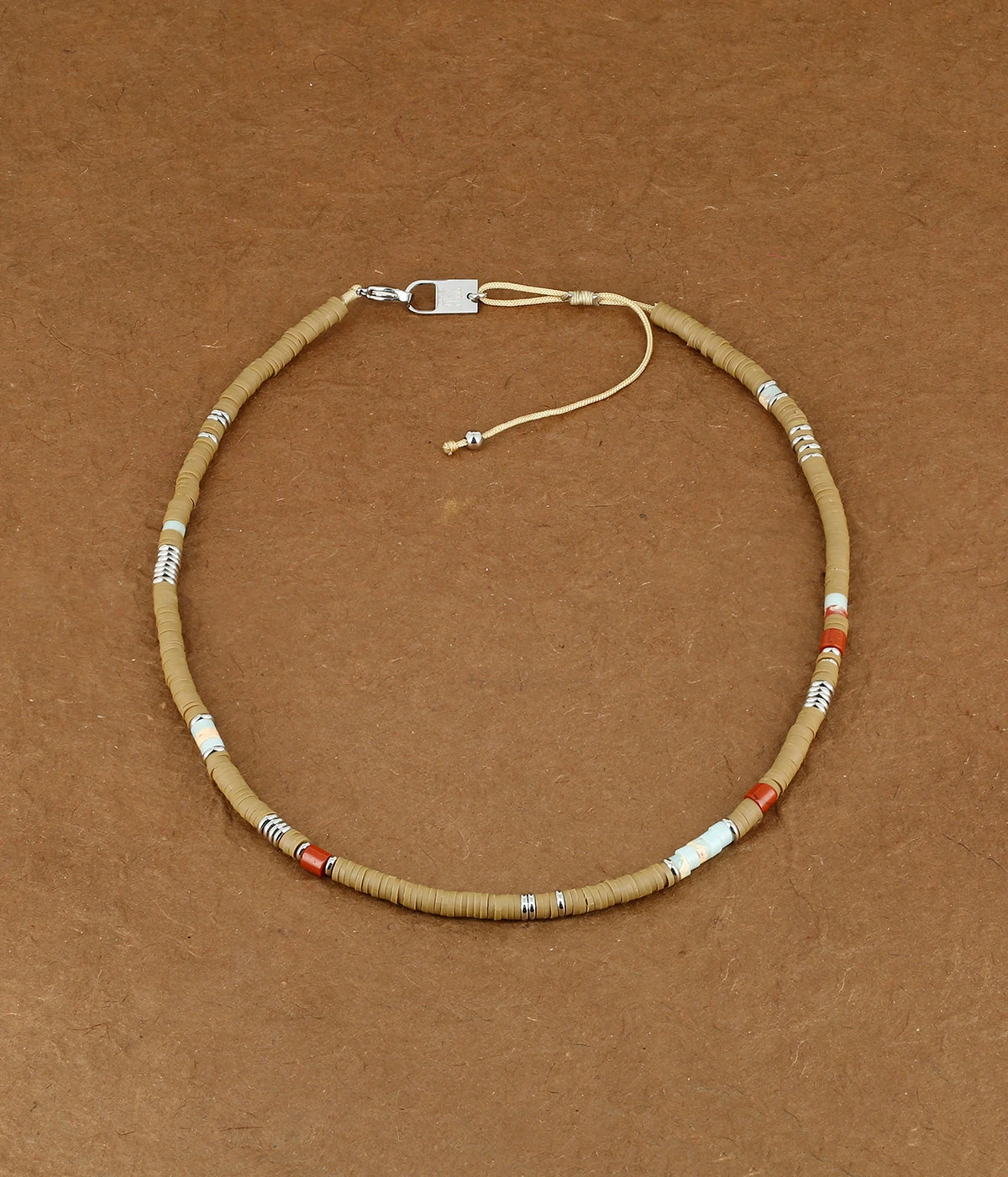 Collier ajustable sur lequel sont enfilées des rondelles colorées et d’acier uni.