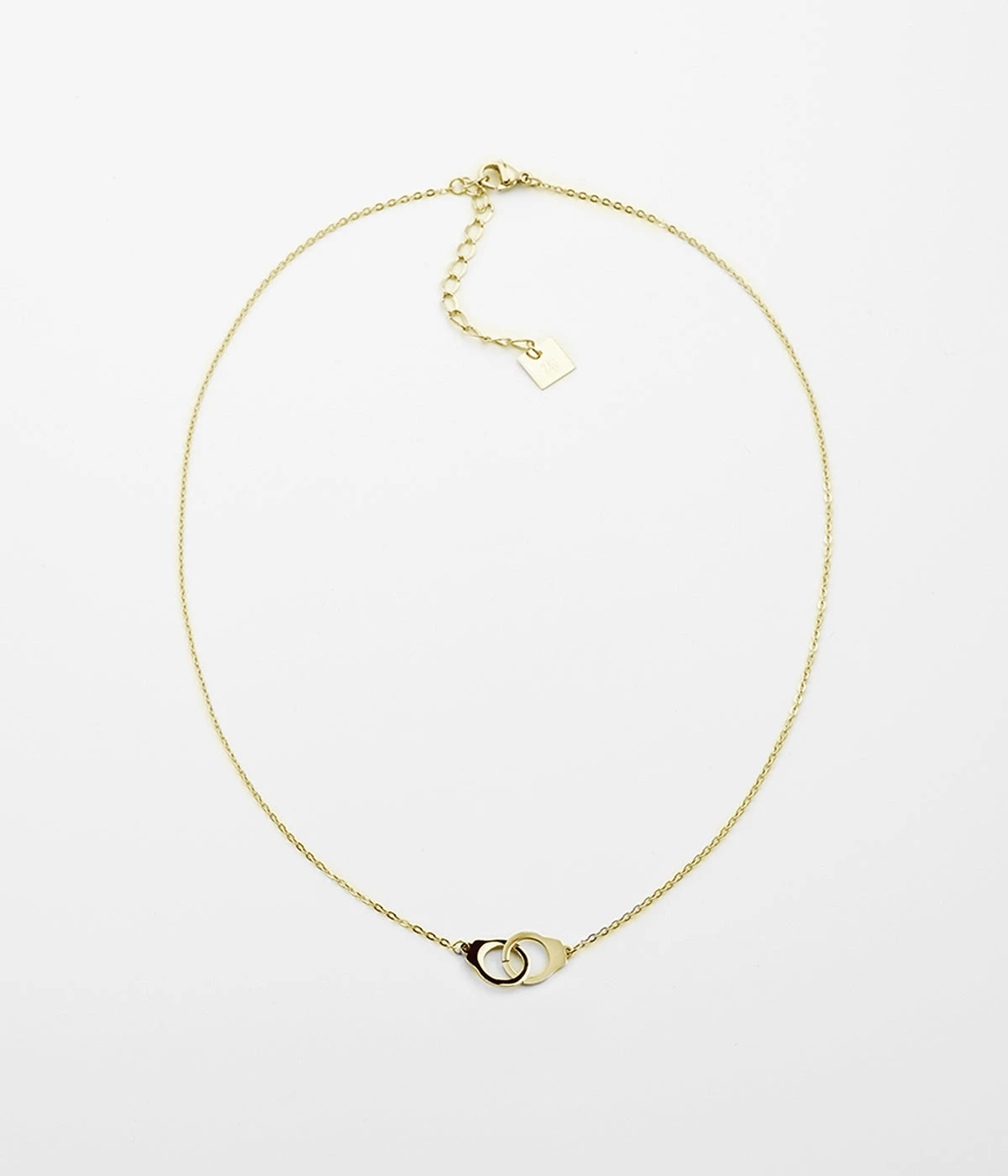 Collier chaîne en acier uni ou doré à l’or fin, sur lequel un motif de menotte est finement accrochée.