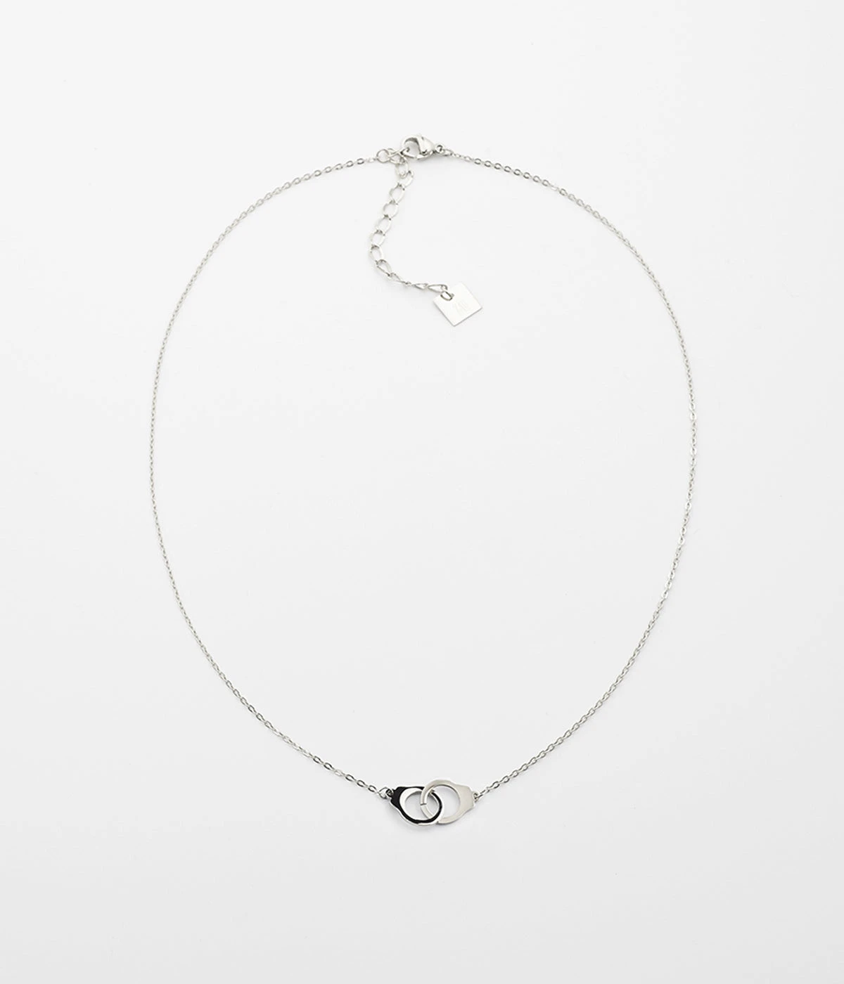 Collier chaîne en acier uni ou doré à l’or fin, sur lequel un motif de menotte est finement accrochée.