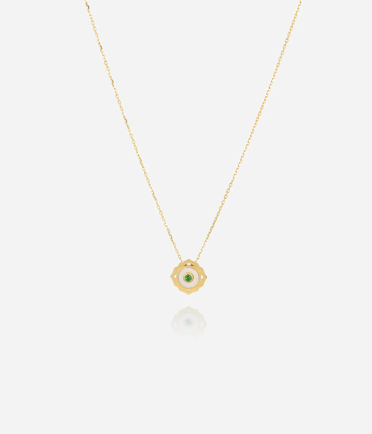 Collier en acier doré à l’or fin sur lequel se trouve un pendentif en forme de fleur en nacre sertie d’un zirconium vert.