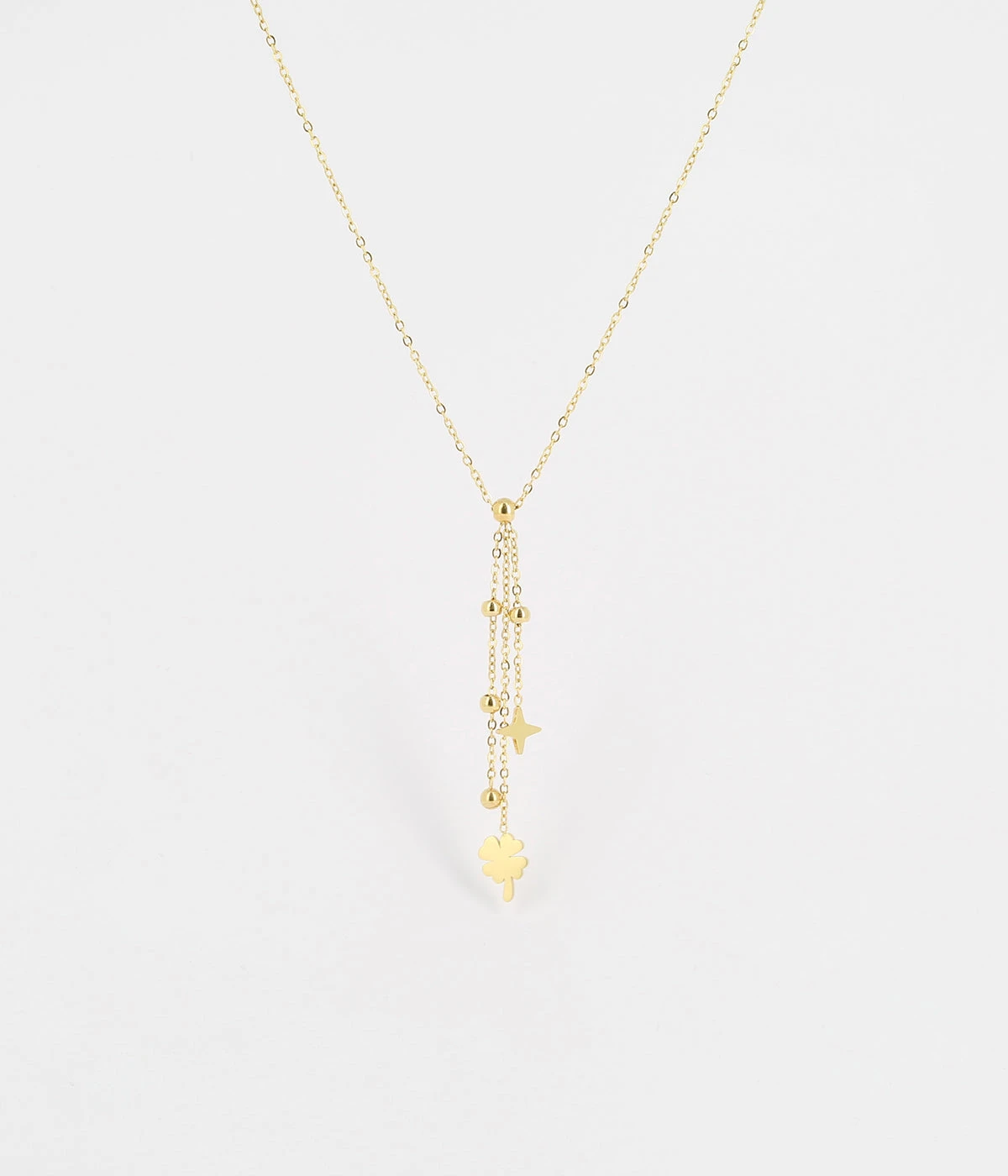 Collier en acier doré à l’or fin dont le pendentif représente des chaînes longeant élégamment le décolleté.