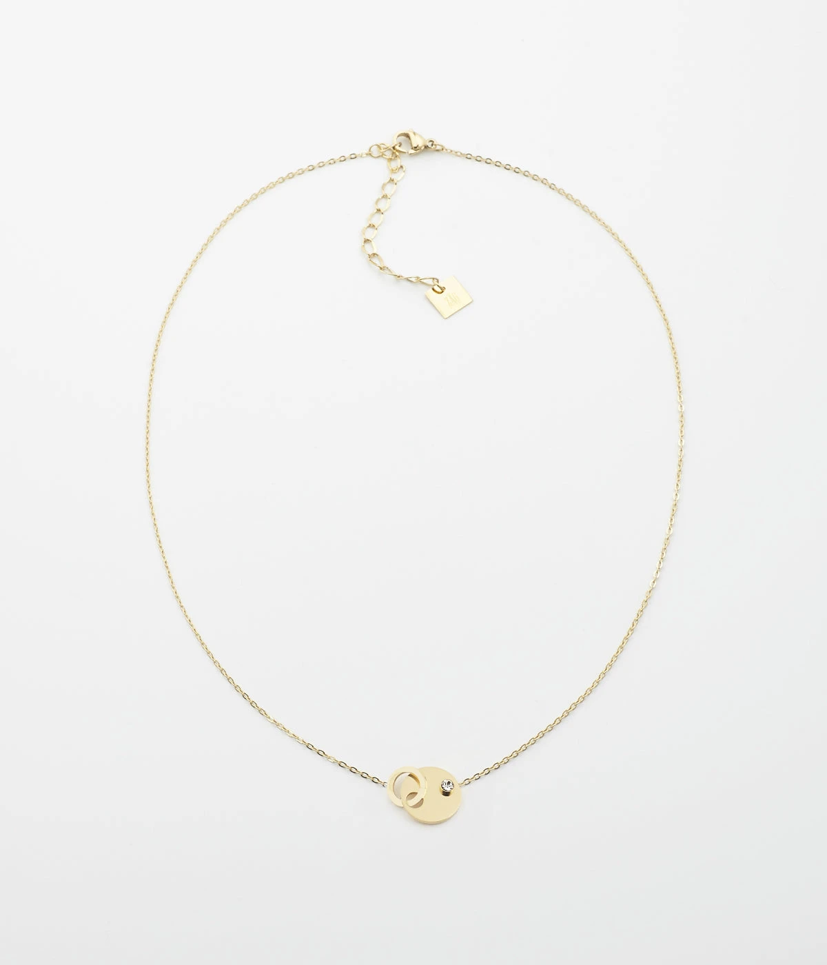 Collier chaînette en acier uni ou doré à l’or fin formé de deux cercles attachés en leur centre et sertis d’un cristal blanc.