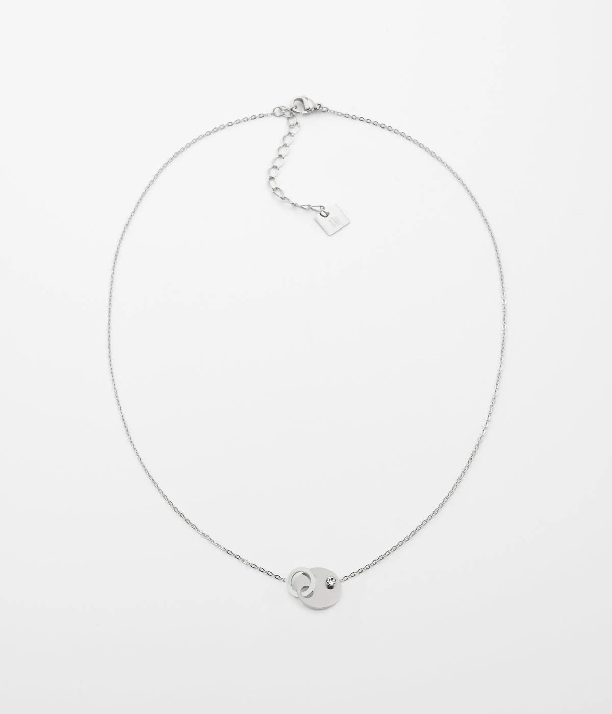 Collier chaînette en acier uni ou doré à l’or fin formé de deux cercles attachés en leur centre et sertis d’un cristal blanc.