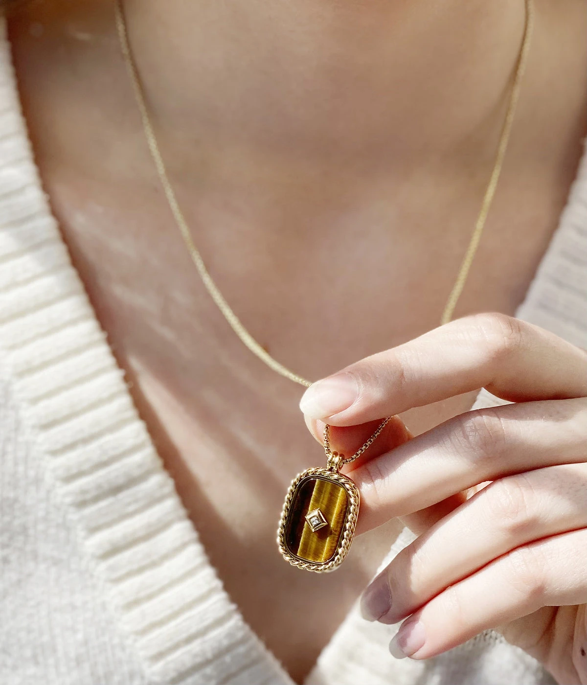 Collier en acier doré à l’or fin sur lequel est attaché un pendentif en acier serti d’une pierre naturelle piquée d’un zirconium serti en son centre.