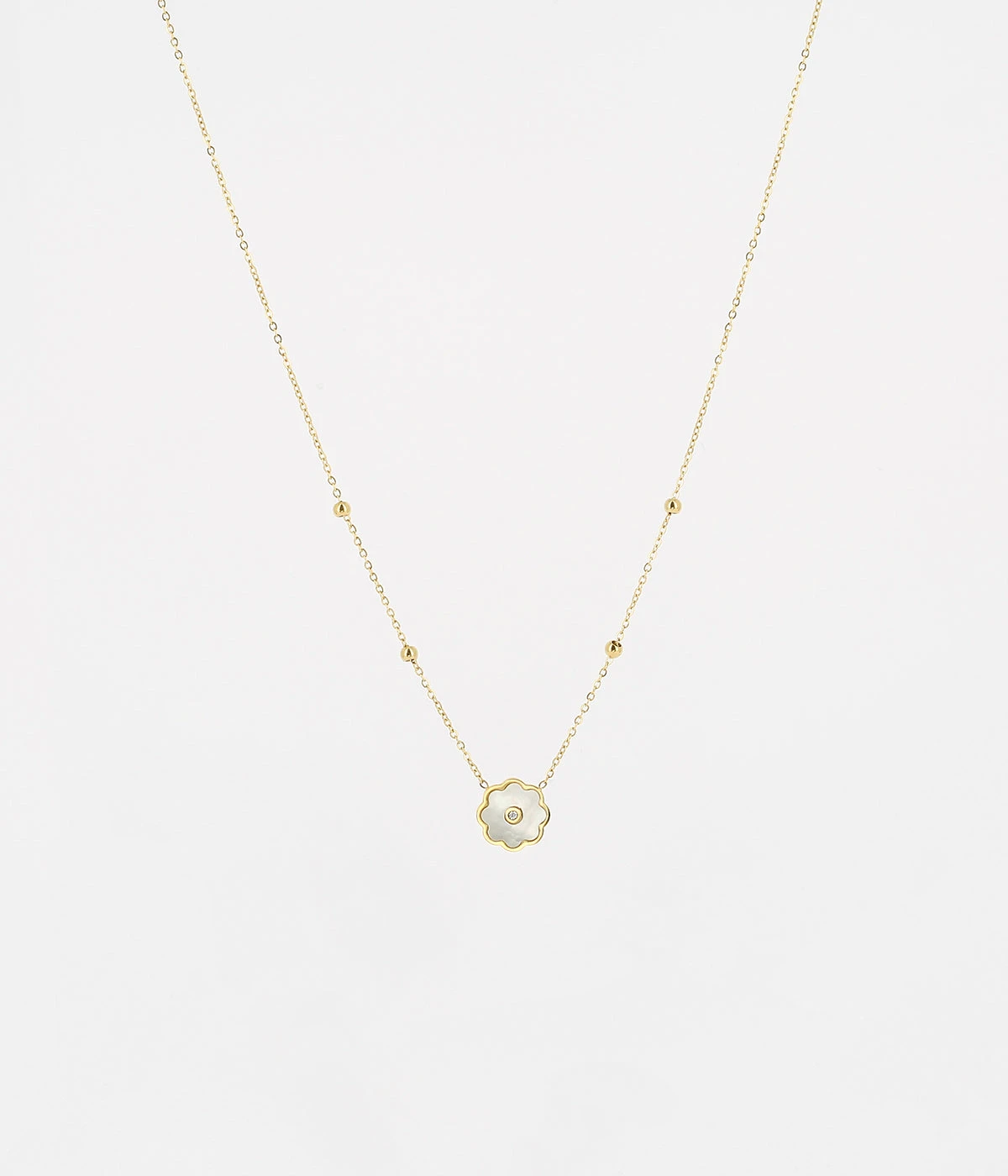 Collier en acier uni ou doré à l’or fin sur lequel une fleur en nacre sertie d’un zirconium en son centre est attaché.