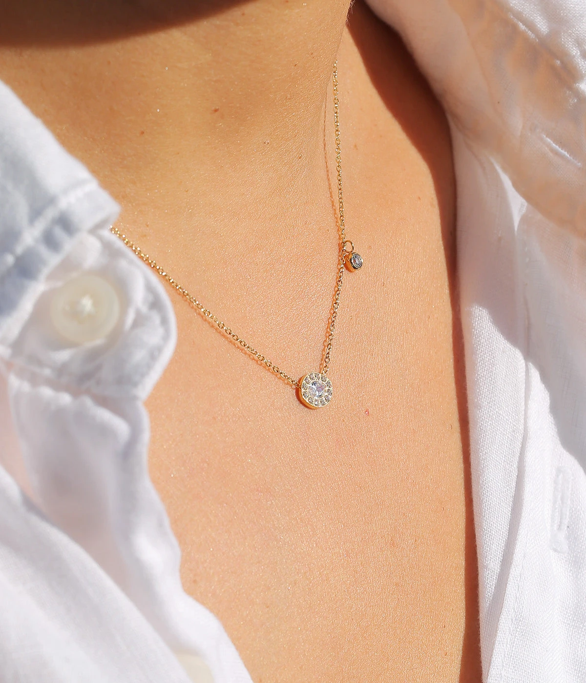 Collier chaîne en acier doré à l’or fin sur lequel sont attachés un motif ovale de zirconiums pavés et une pampille brillante en serti clos.