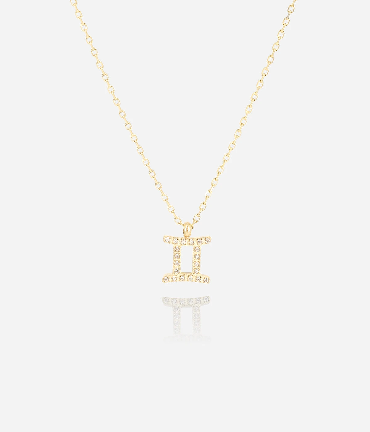 Collier en acier doré à l’or fin sur lequel se trouve un pendentif représentant le signe du zodiaque Gémeaux, serti de zirconiums.