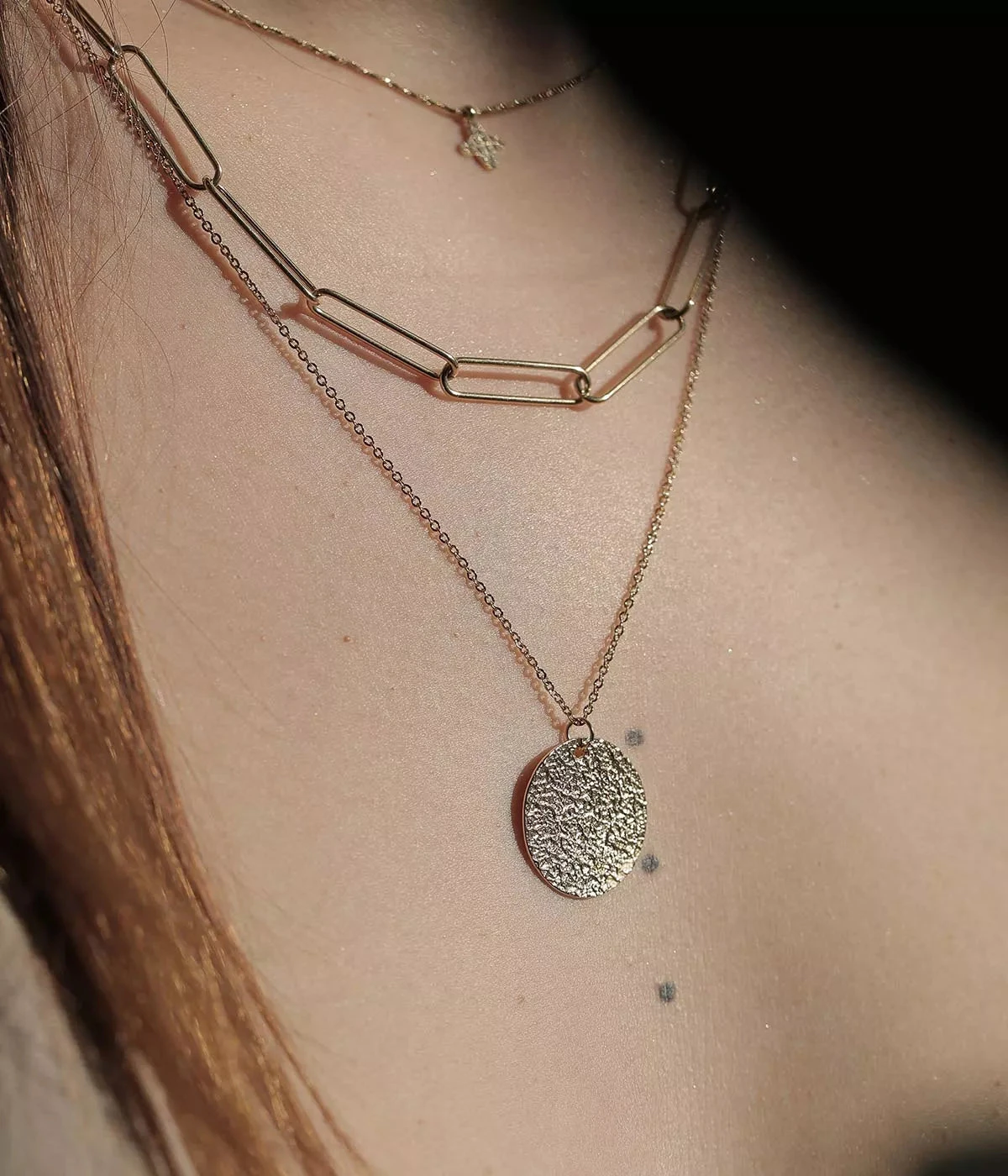 Collier double chaîne en acier uni ou doré à l’or fin. Une première chaîne à gros maillons très contemporaine est associée à une chaîne forçat classique sur laquelle est attachée une médaille martelée.