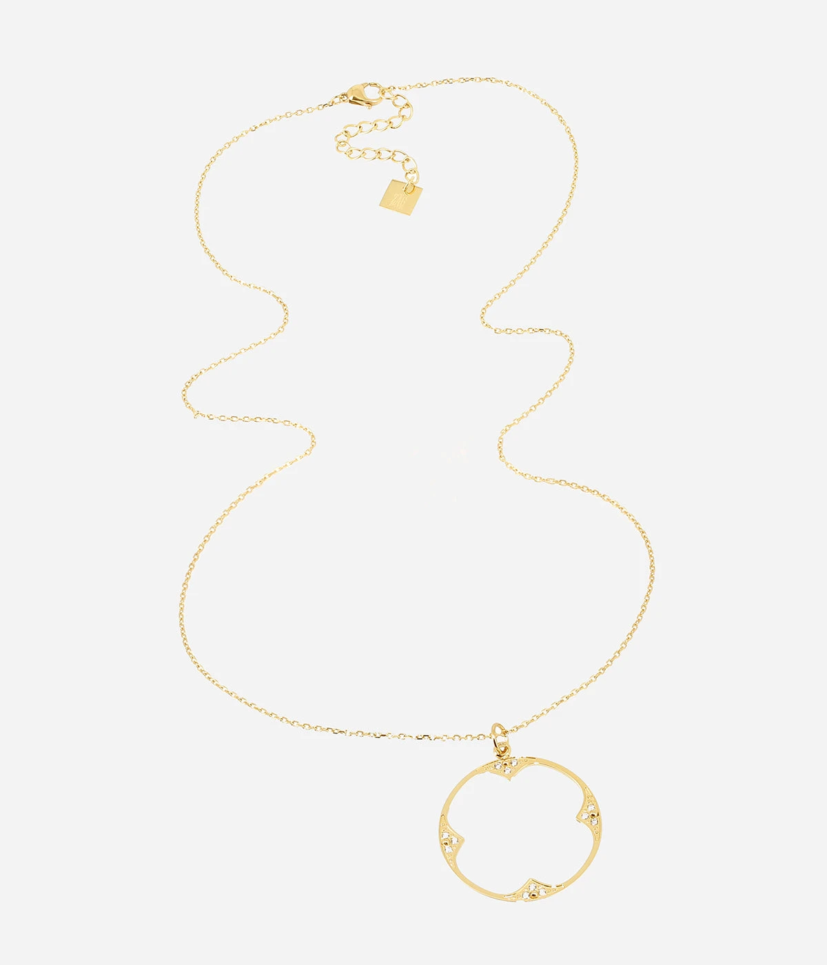 Collier en acier doré sur lequel est suspendu un cercle serti de zirconiums avec un trèfle en son milieu.