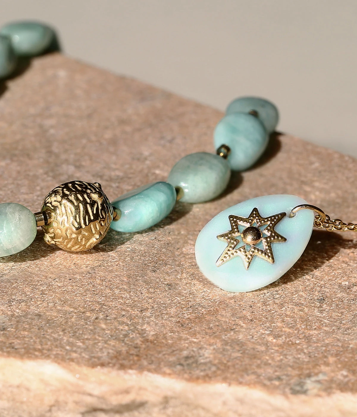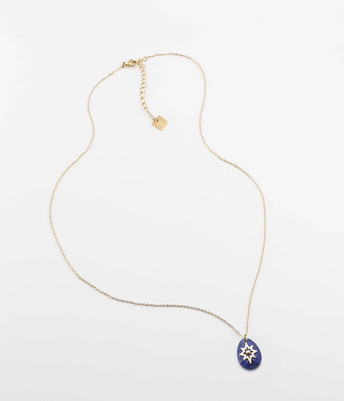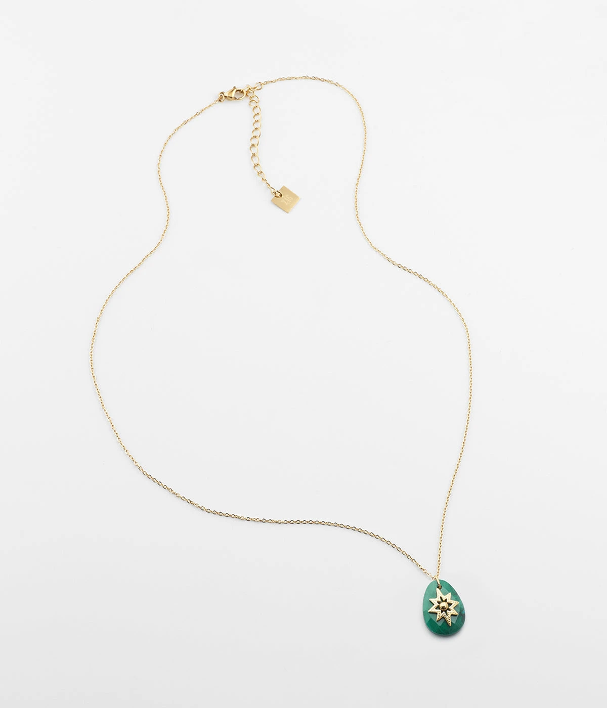 Collier chaîne en acier doré à l’or fin sur lequel est accroché un pendentif de pierre naturelle piquée d’un motif doré.