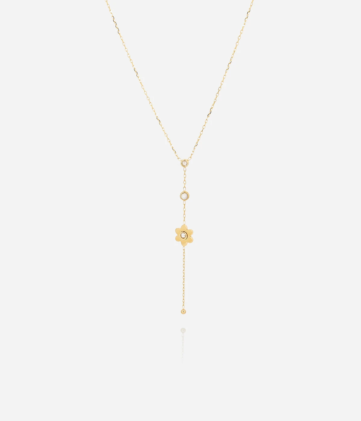Collier en acier doré à l’or fin en Y. Une chaînette sur laquelle se trouvent un zirconium, une pierre et un motif de fleur sertie d’un zirconium tombe parfaitement dans le décolleté.