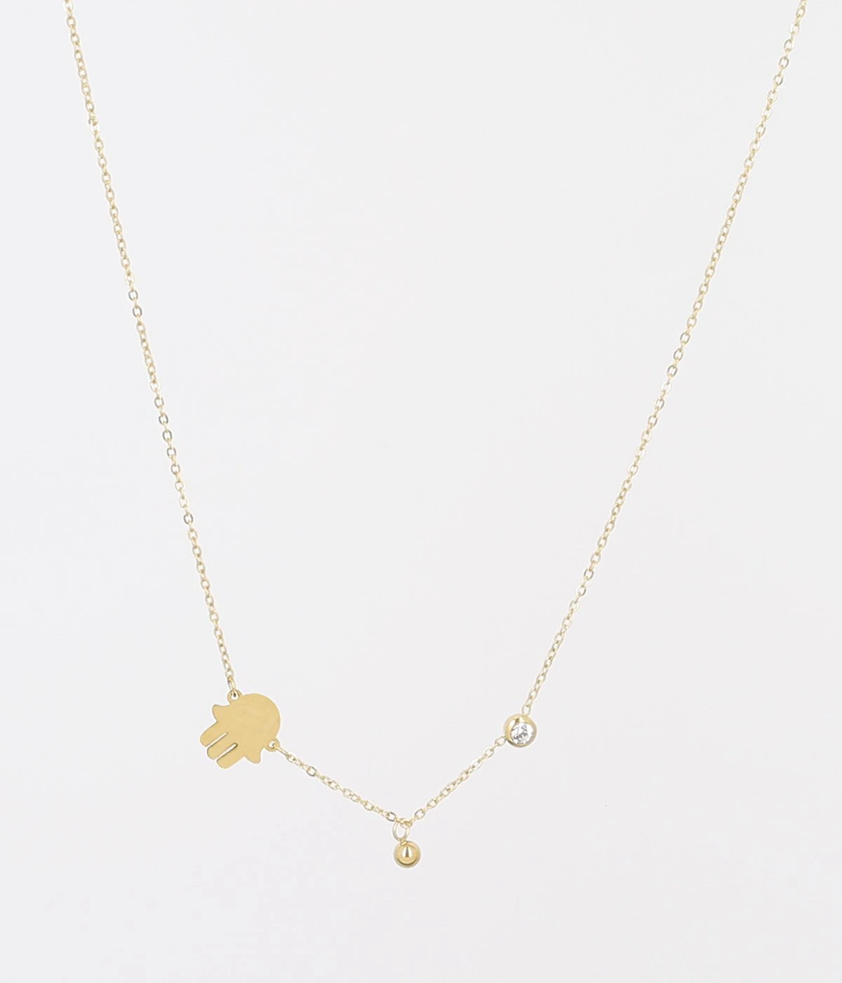 Collier chaîne en acier uni ou doré à l’or fin sur lequel est attaché un motif ciselé en forme de petite main et un zirconium serti clos. Le motif de ce collier est un signe universel de protection depuis des siècles.