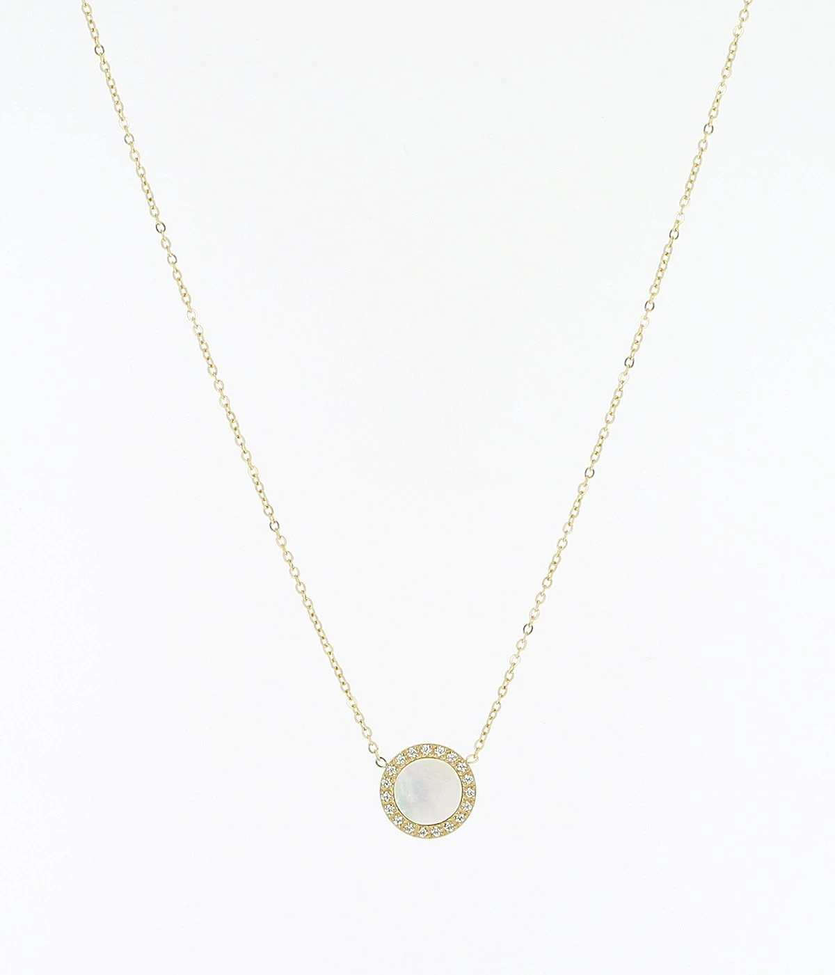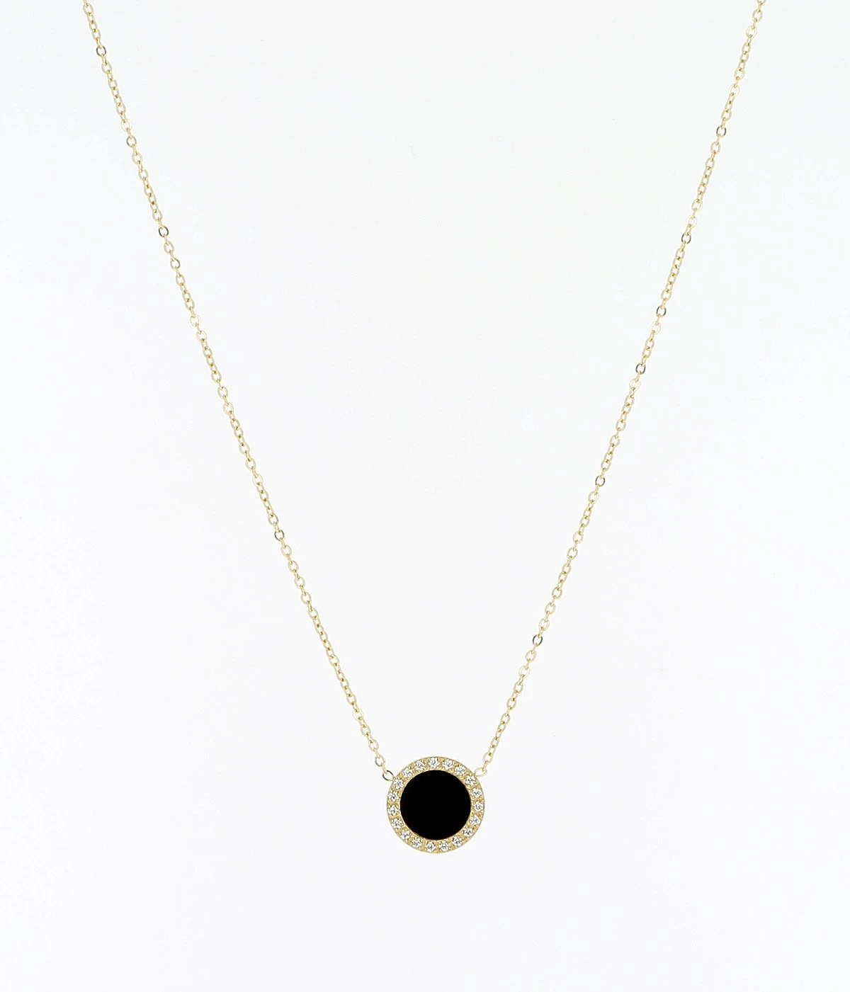 Collier chaîne en acier uni ou doré à l’or fin sur lequel est attachée une médaille de nacre ou de bakélite noire, sertie de zirconiums.