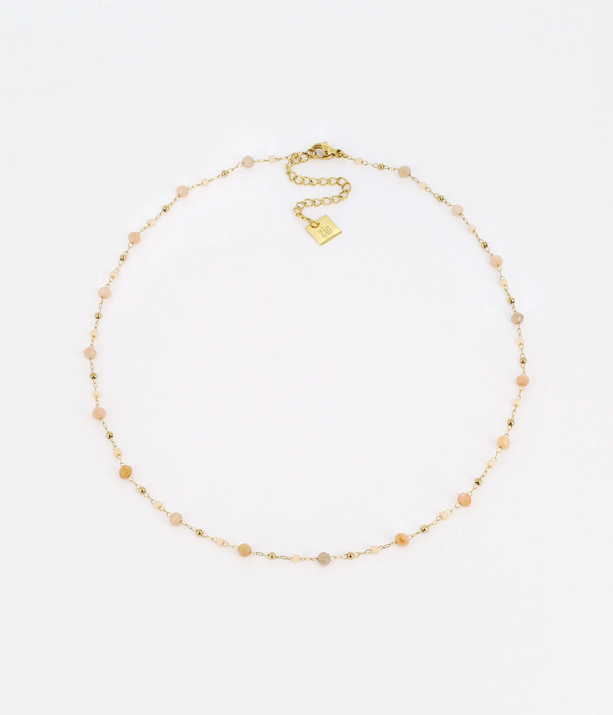 Collier en acier doré à l’or fin parsemé de petites boules dorées et colorées taillées à la main.