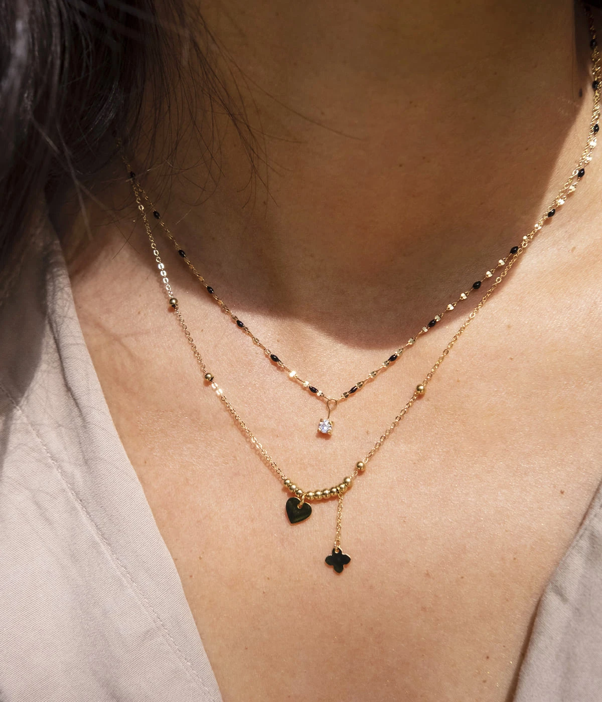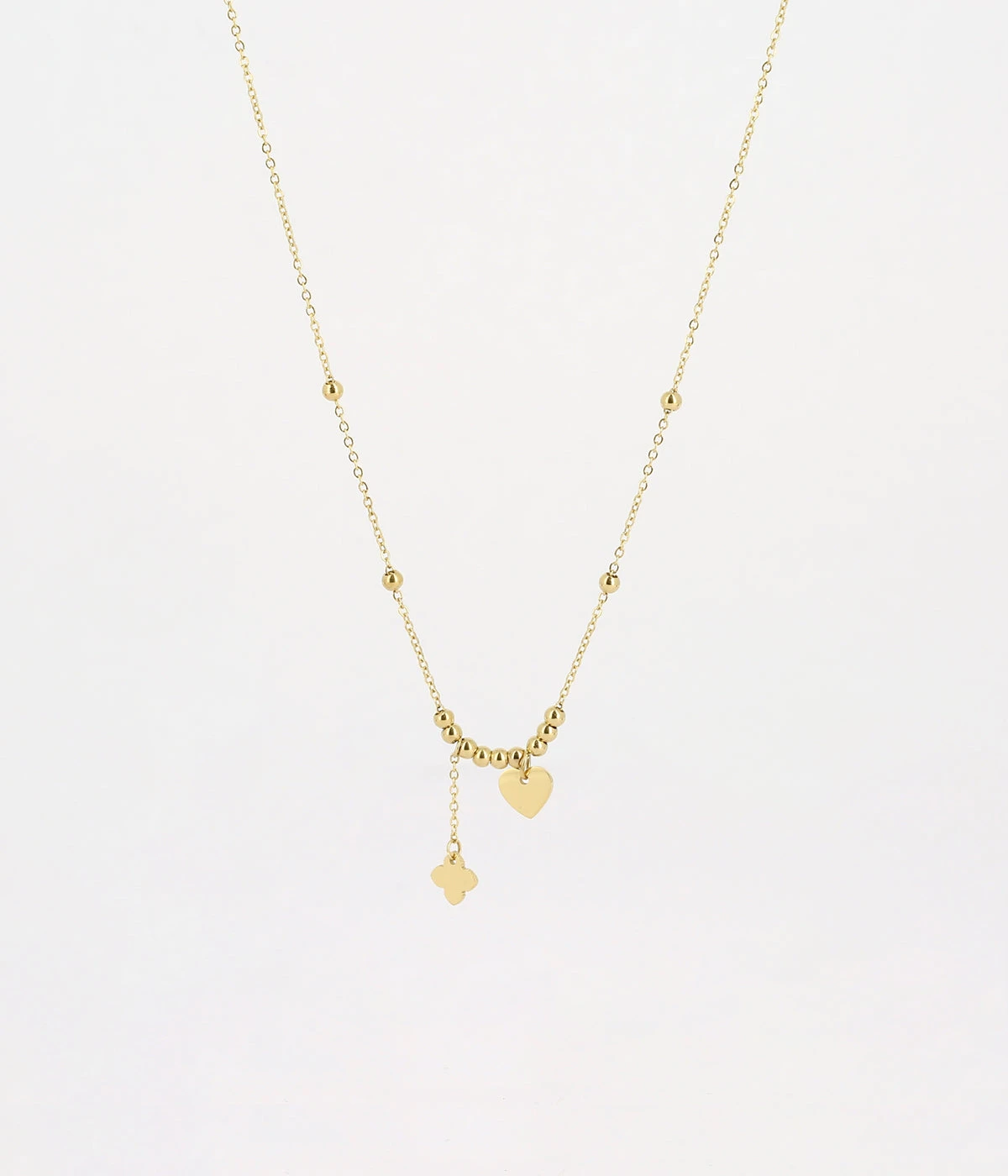 Collier en acier uni ou doré à l’or fin sur lequel sont enfilées des petites boules en acier et suspendus des petits motifs en forme de cœur et de trèfle.