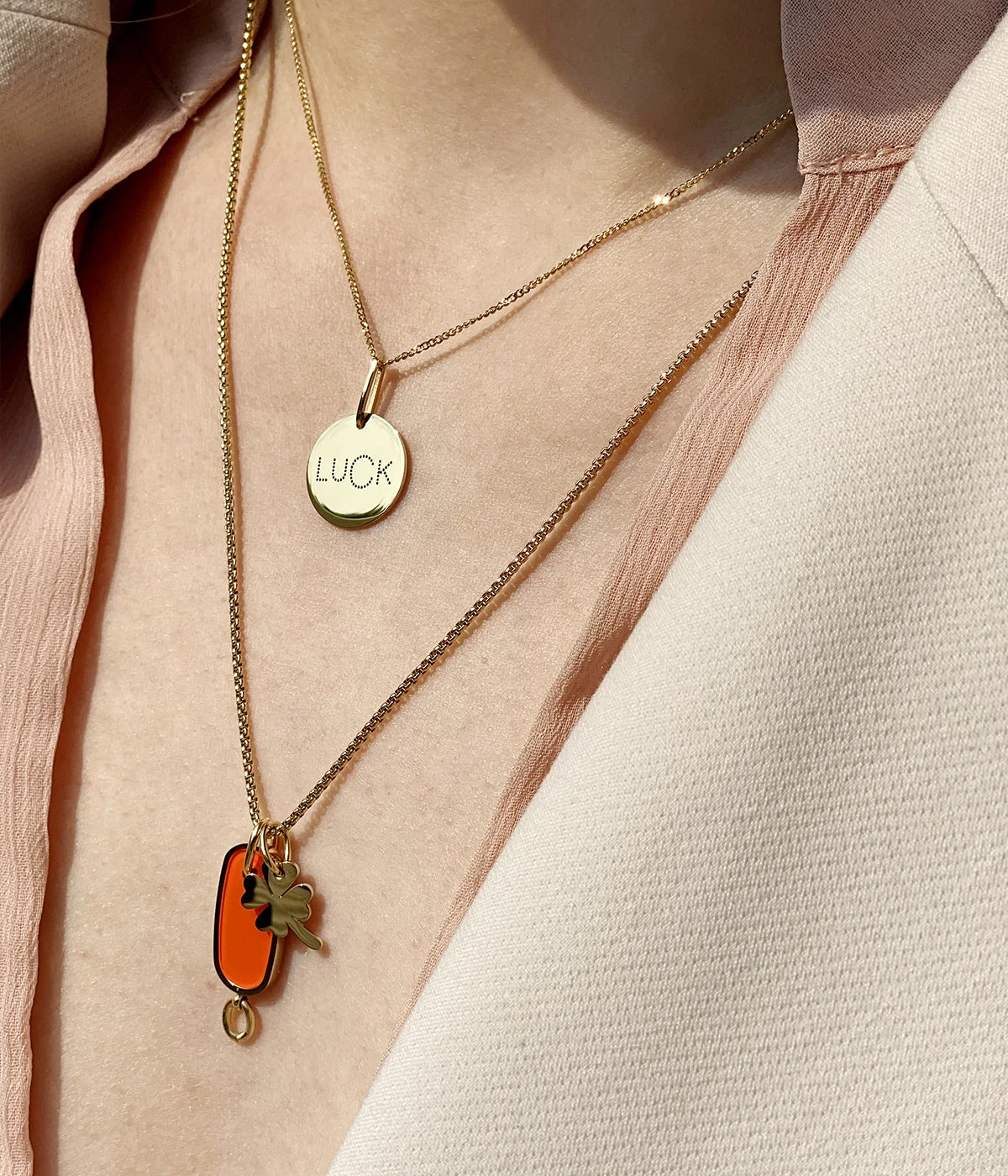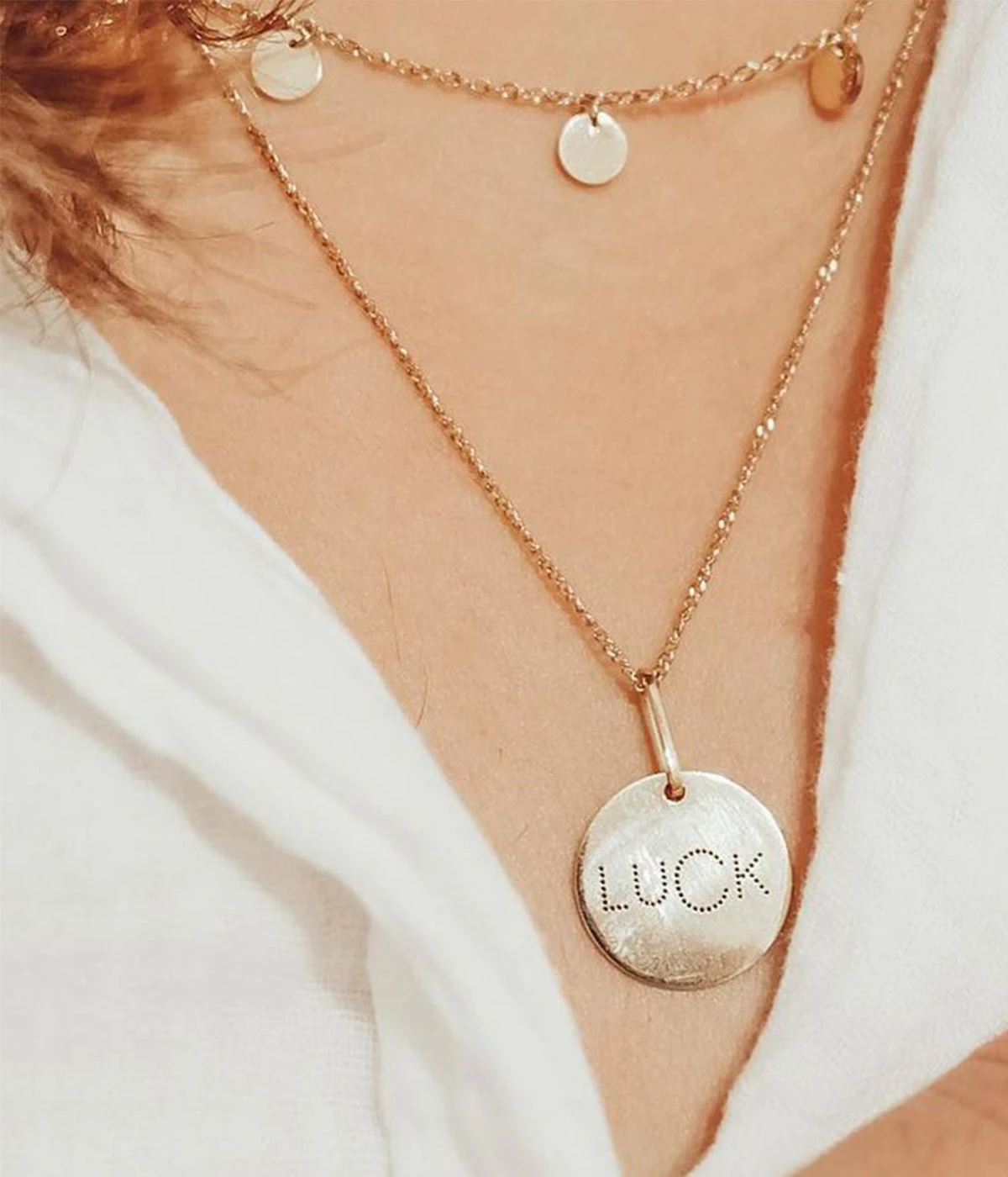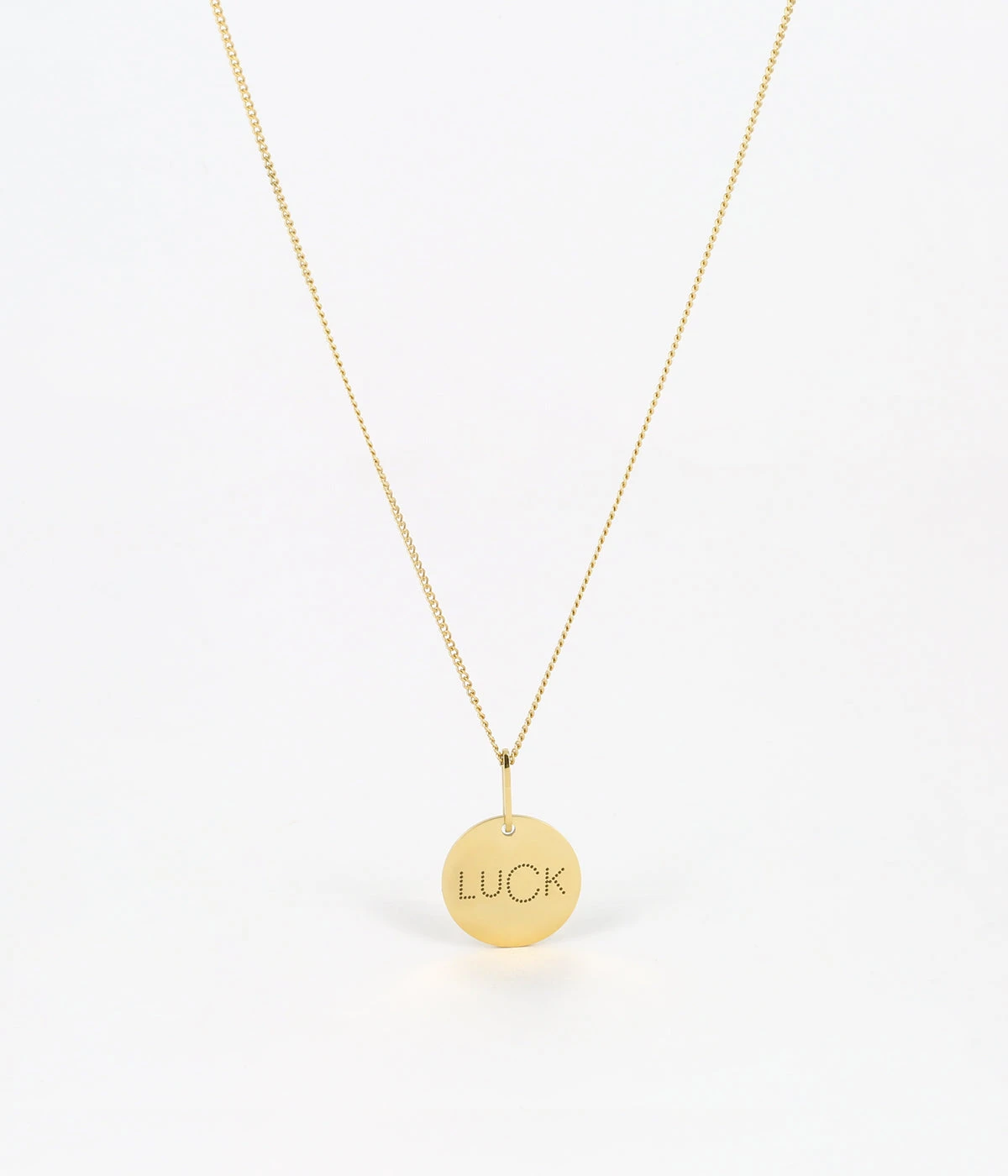 Collier chaîne en acier uni ou doré à l’or fin sur laquelle une médaille gravée du mot « Luck » est attachée.