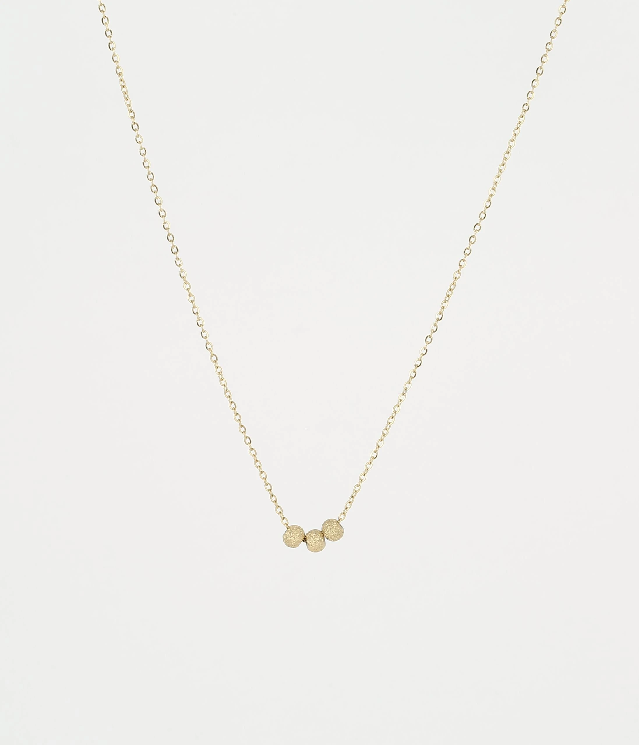 Collier chaînette en acier doré à l’or fin sur lequel est enfilé trois petites boules dorées irisées.