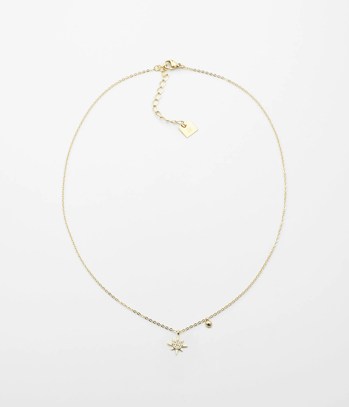 Collier chaîne en acier doré à l’or fin. Deux ornements sont attachées à la chaîne, l’un est un motif d’Étoile du Nord sertie de zirconium et l’autre, une petite boule doré.