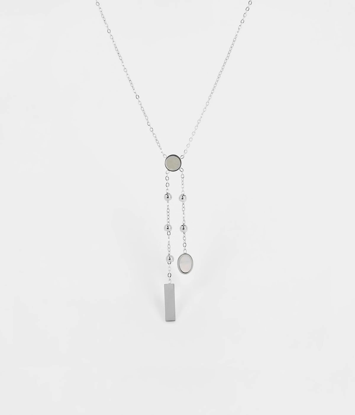 Collier en acier uni ou doré à l’or fin dont le pendentif nacré possède 2 chaînes tombantes, donnant une élégance au bijou.