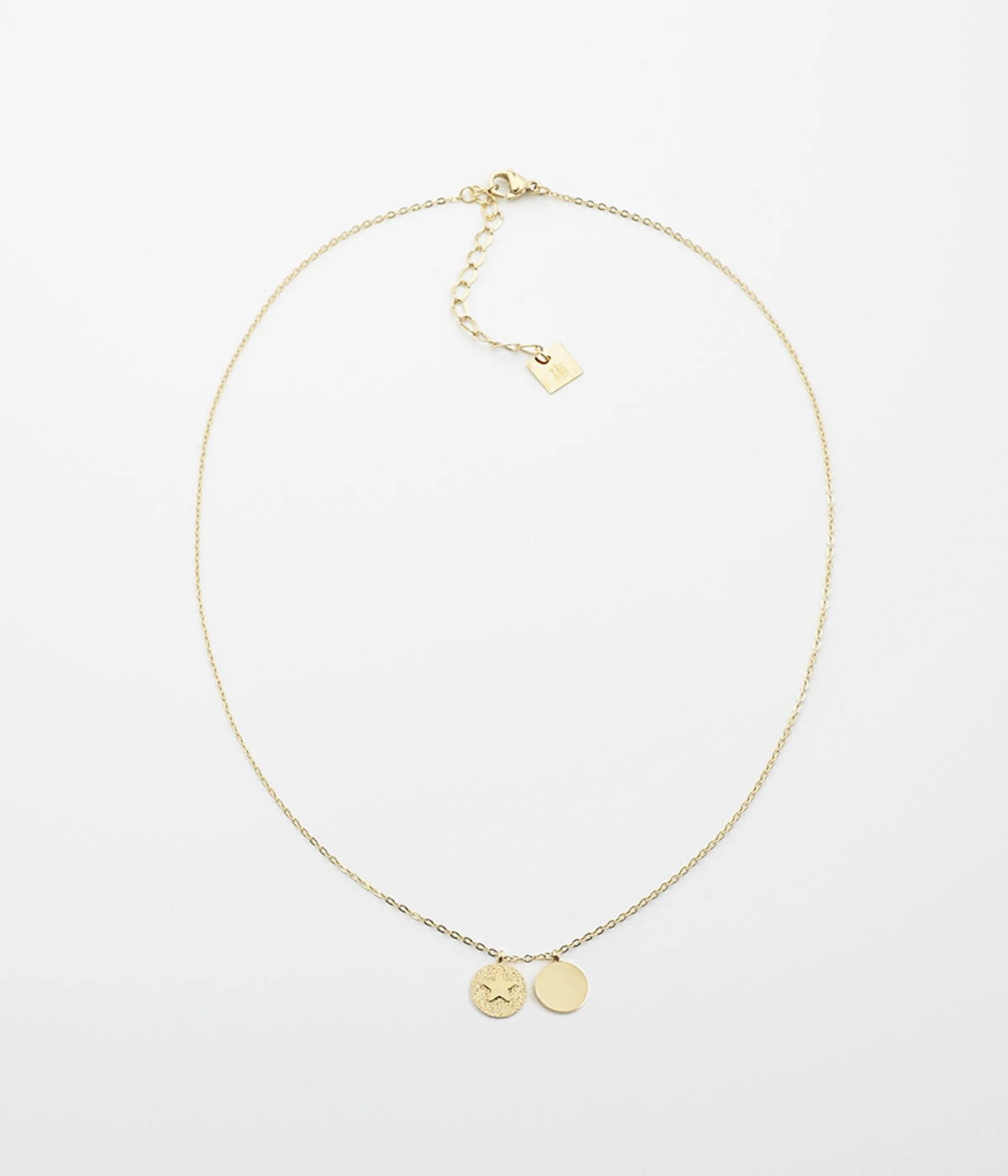 Collier chaînette en acier doré à l’or fin sur lequel deux petites médailles pampilles sont attachées, dont l’une est piqué d’un motif étoile.