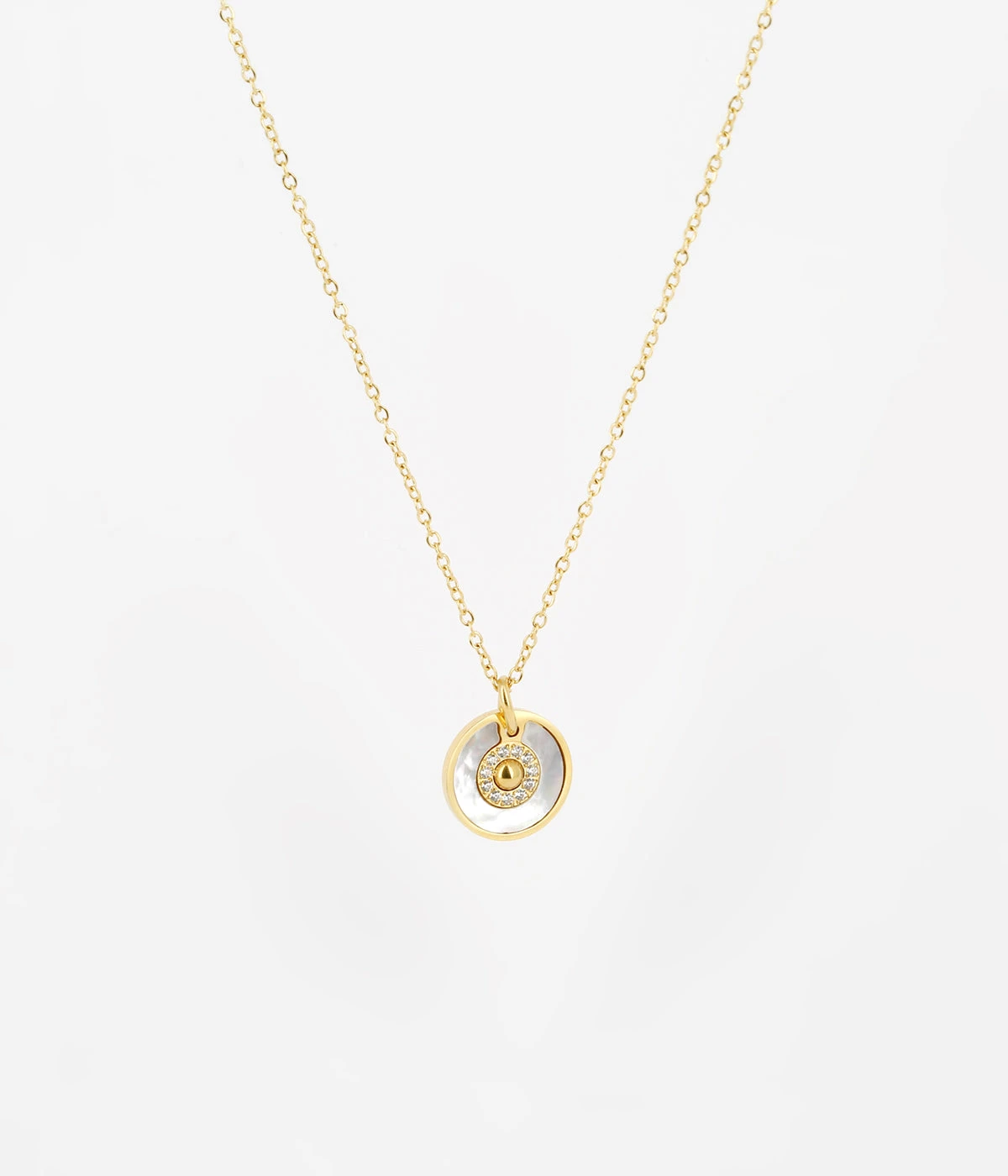 Collier en acier doré à l’or fin sur lequel un pendentif rond nacré, serti de zirconiums est attaché.
