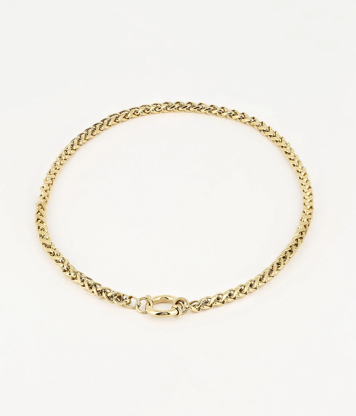Collier en acier uni ou doré à l’or fin, en maillons, décoré d’un anneau au niveau du fermoir.