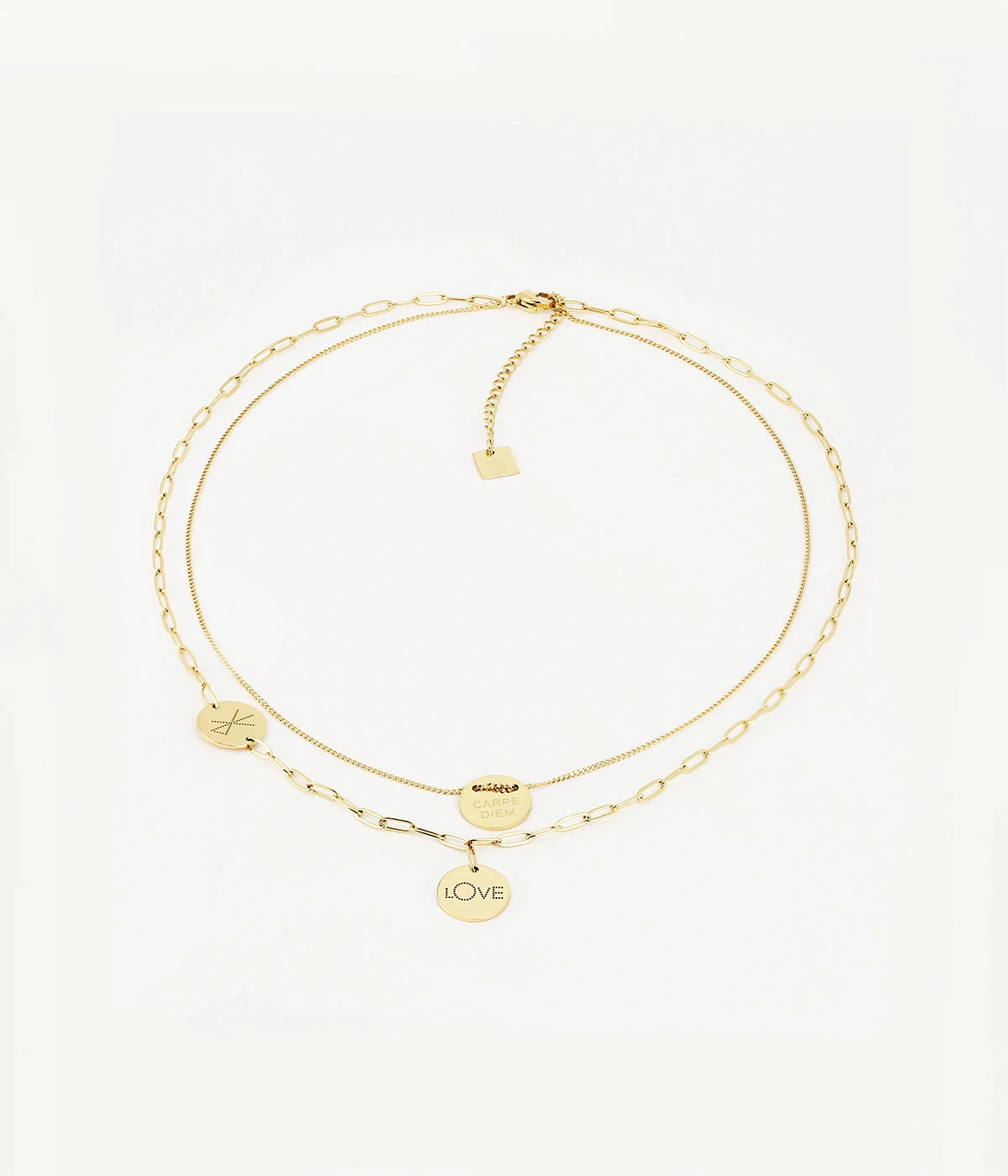 Collier double chaîne en acier uni ou doré à l’or fin sur lequel est attachée une médaille gravée du mot « Love».