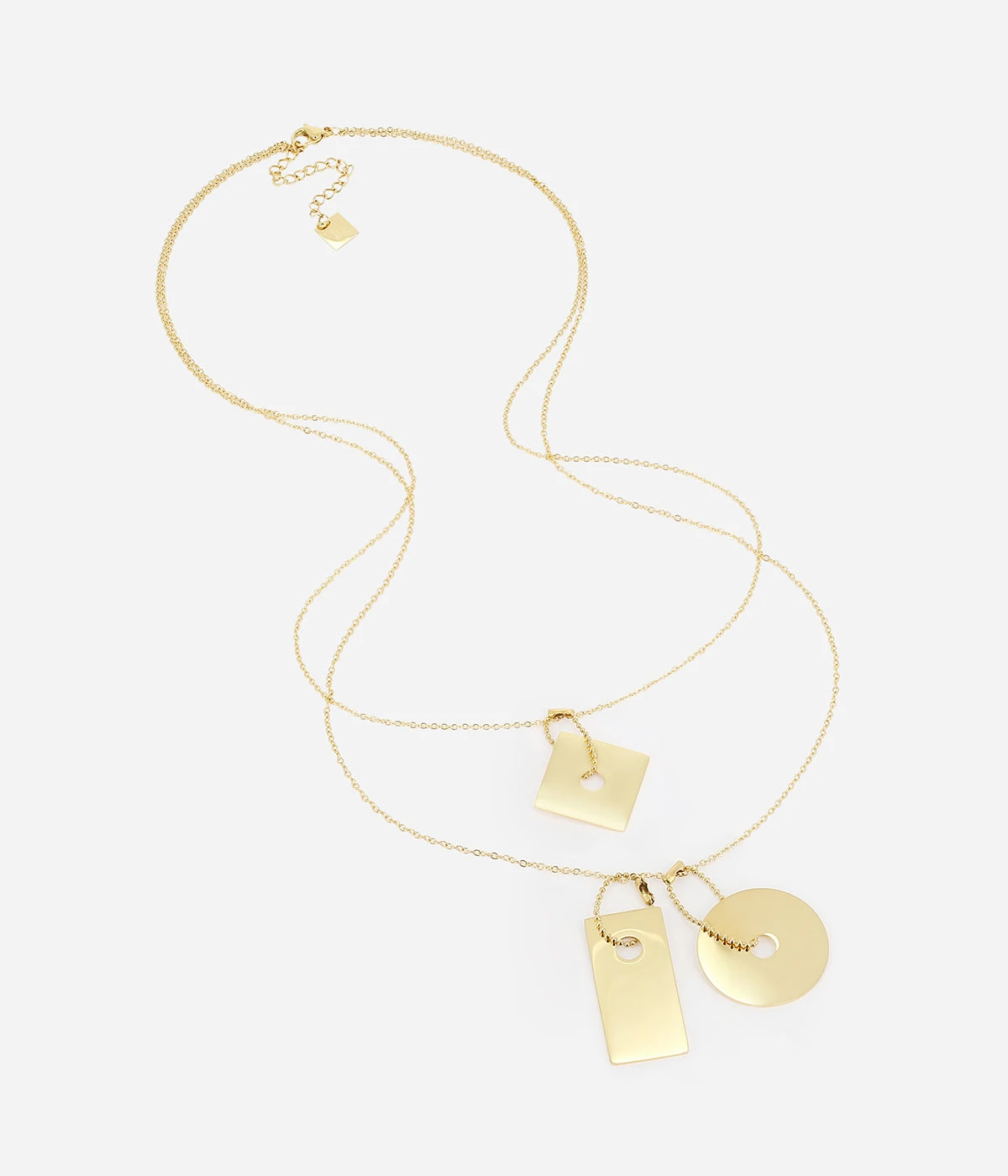 Collier à 3 rangs en acier uni ou doré à l’or fin sur lequel sont suspendus des pendentifs de forme géométrique.